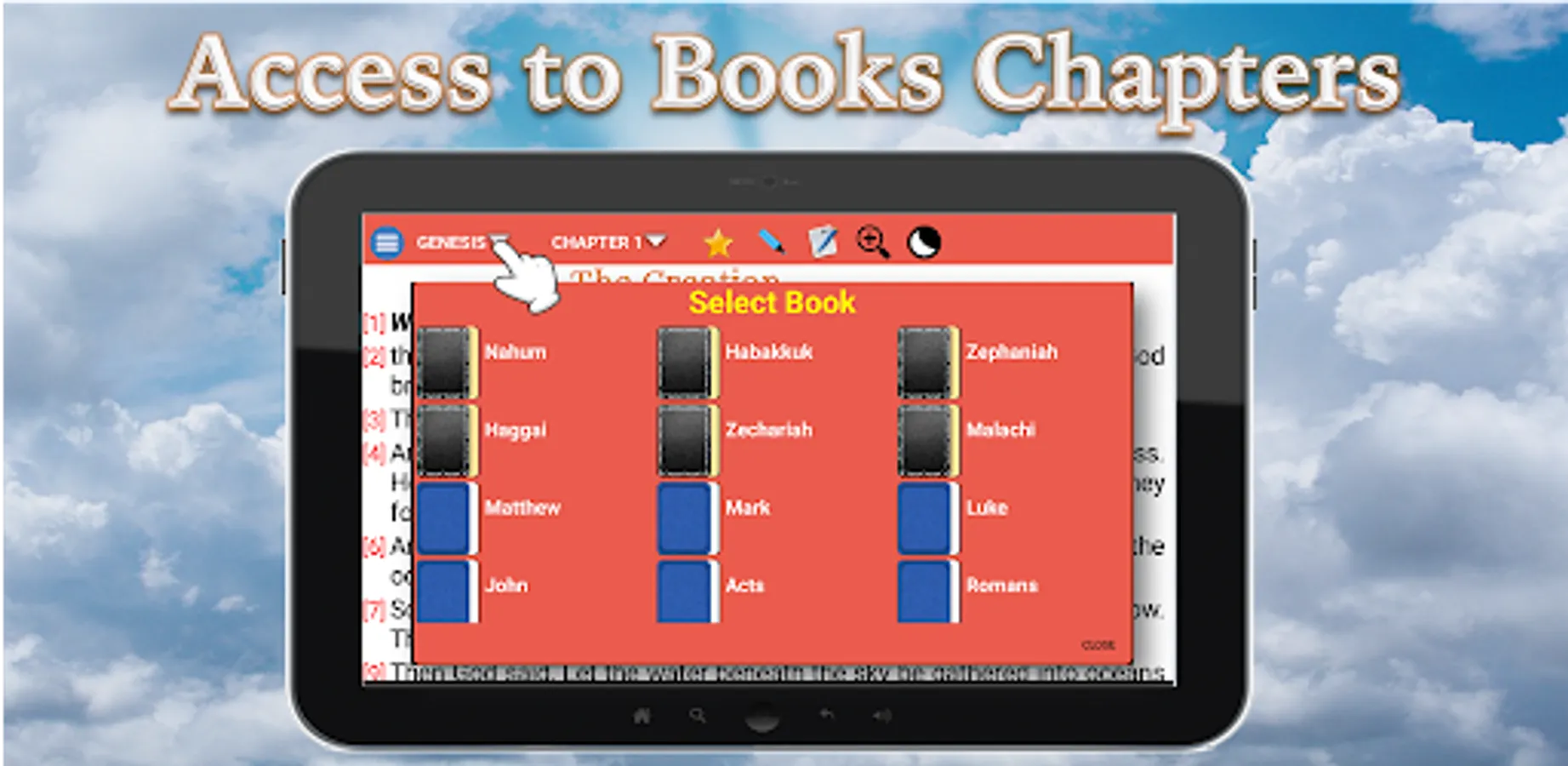 You can click on the screen and the lower part will show the name of the book and the chapter, when pressed, the list of books will appear and in the other the chapters that the selected book has.