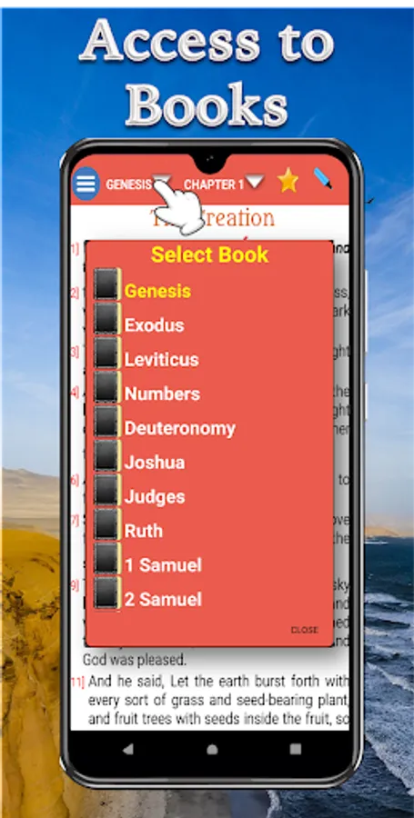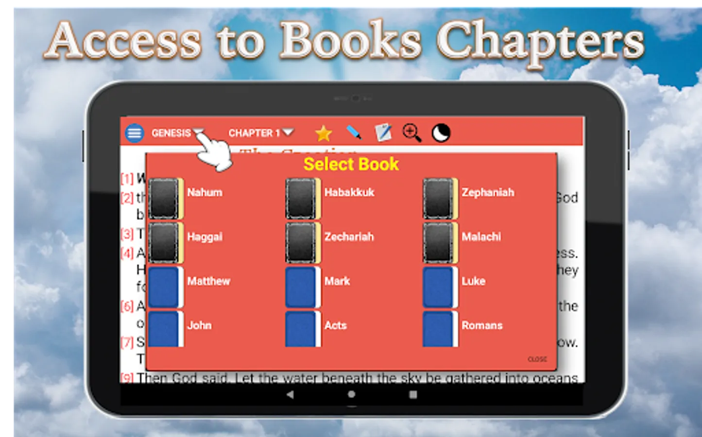 You can click on the screen and the lower part will show the name of the book and the chapter, when pressed, the list of books will appear and in the other the chapters that the selected book has.
