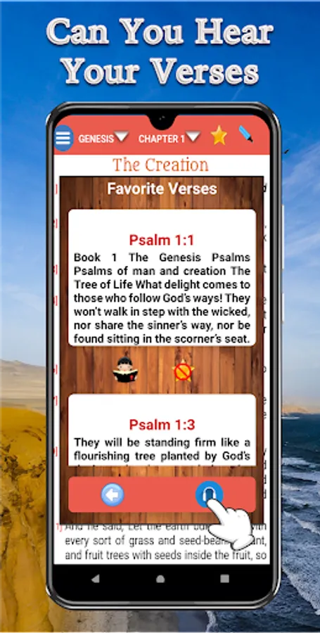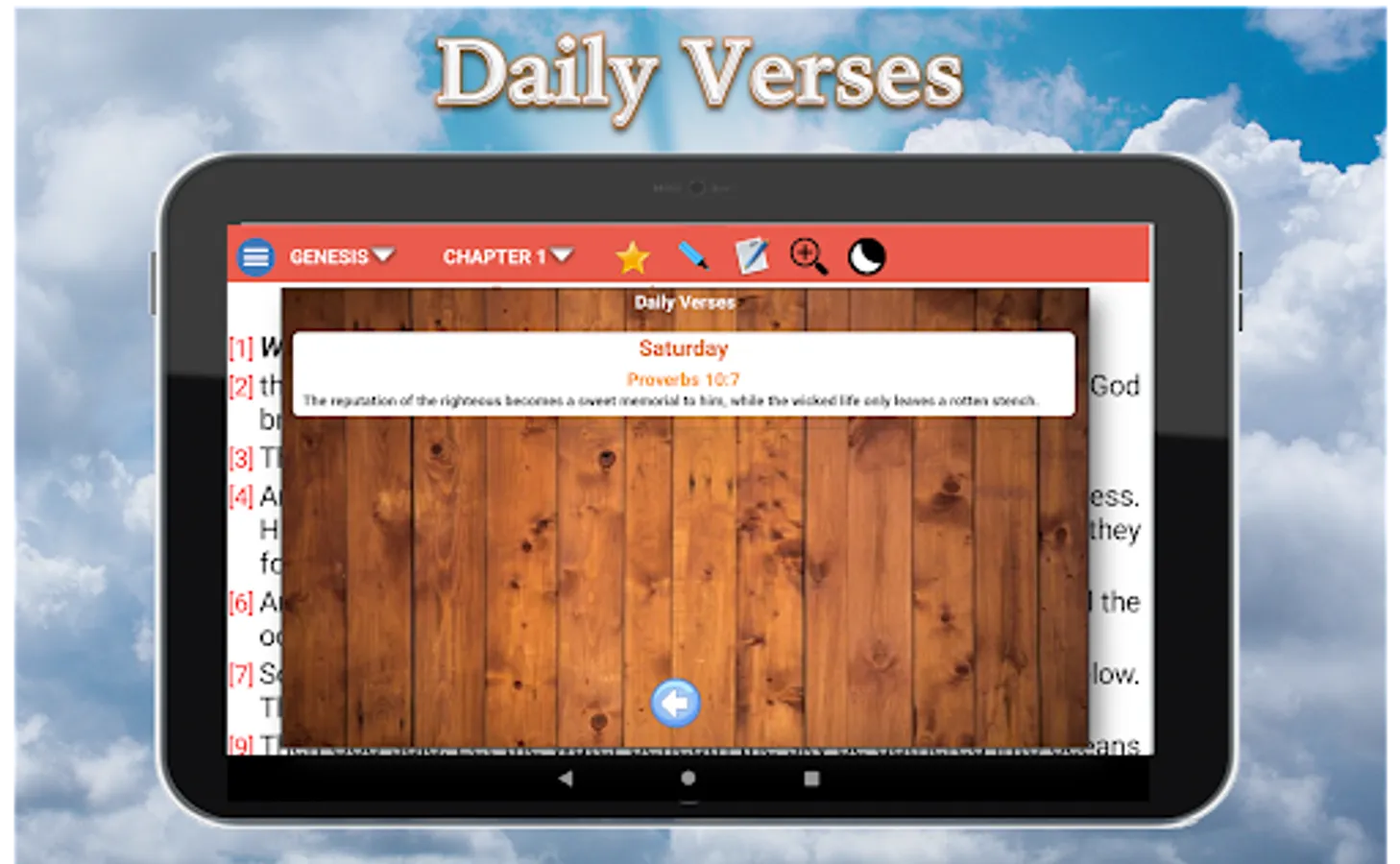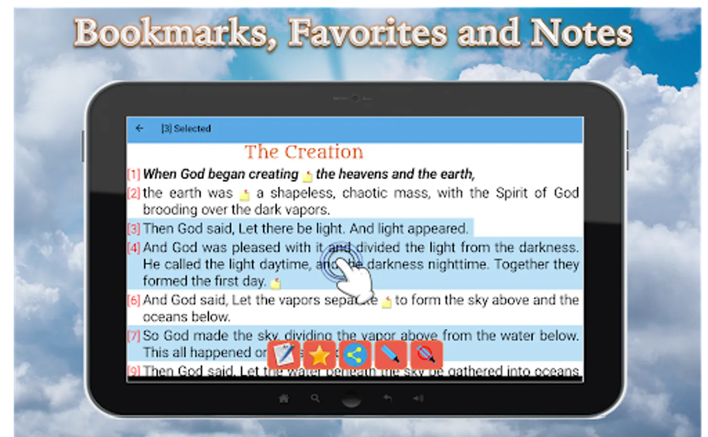 You can select one or several verses of a chapter and mark as a favorite you can also share with your friends the verses in the different social networks. By clicking on the favorite clip, you will see the verses that you marked for quick access.