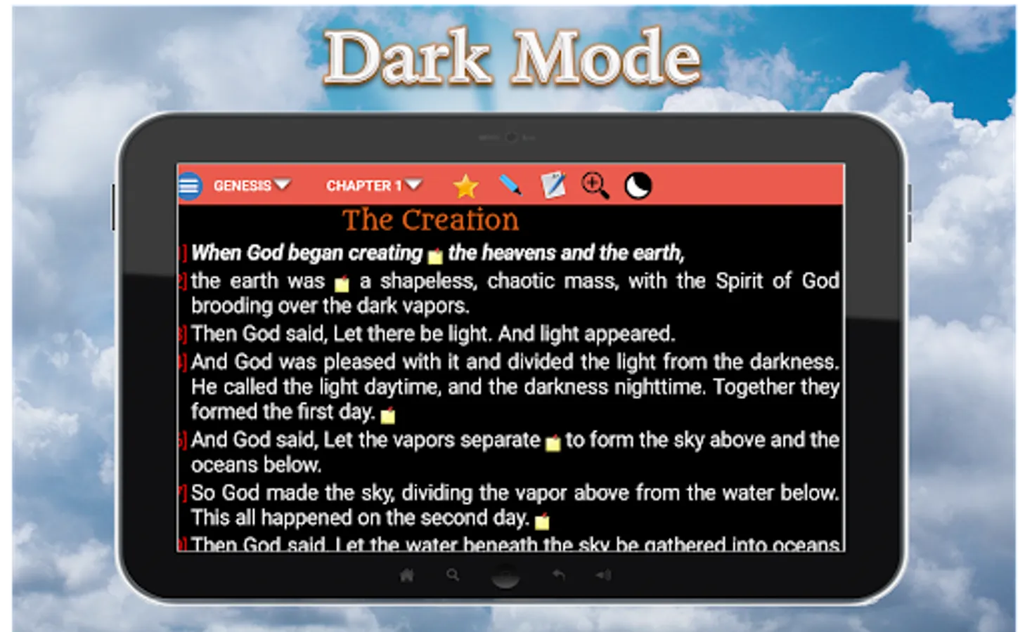 Access to the options menu quickly and sensibly. Option to change the text size. Change of reading background of the book. Access to favorite chapters and verses. Search for words in books, chapters and verses. Night mode to facilitate reading and decrease the light of the screen.