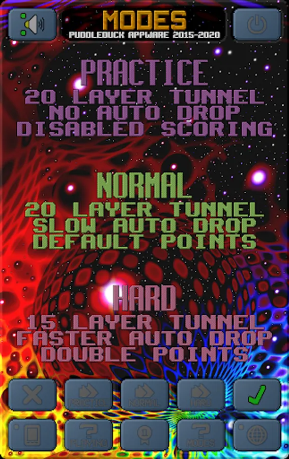 Hard mode : The piece moves forward once every 1/2 second, so you have to think quicker. The tunnel is also shorter, so you've got added pressure. Has a bonus, every point you score in this mode is doubled.