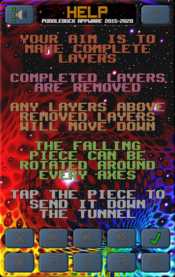 Practice mode : The piece never goes down the tunnel until you tap it, giving you all the time you need to decide how you want it. This mode will also help you get used to what each of the spin / roll / rotate / movement buttons do. This mode doesn't give you a score, but at the end, when you can't place any more pieces, you are still told how well you did.
