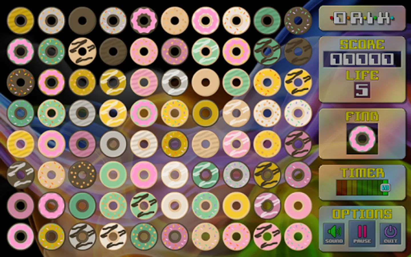 This is a game of memory and speed ... can you find the ORIX before the timer runs out? You have 3 modes of play, each slightly different ... The first, where you start with five lives, find the ORIX that's displayed and it will disappear. The quicker you find it, the more points you get. Once you've found all of them, you'll move onto the next level, where the points you score will be slightly higher. The second mode, where you start with three lives, and finding the ORIX is slightly easier. Instead of the ORIX disappearing, they are replaced, so you could have two or more of the same ORIX. The final mode, you only have one life, there's no levels, and you get slightly longer to find them. How far can you get? If finding the donut styled ORIX proves a bit too much of a challenge, then swap to animals, it might make things slightly easier for you, but the gameplay will remain the same.
