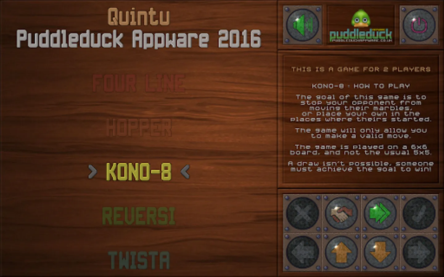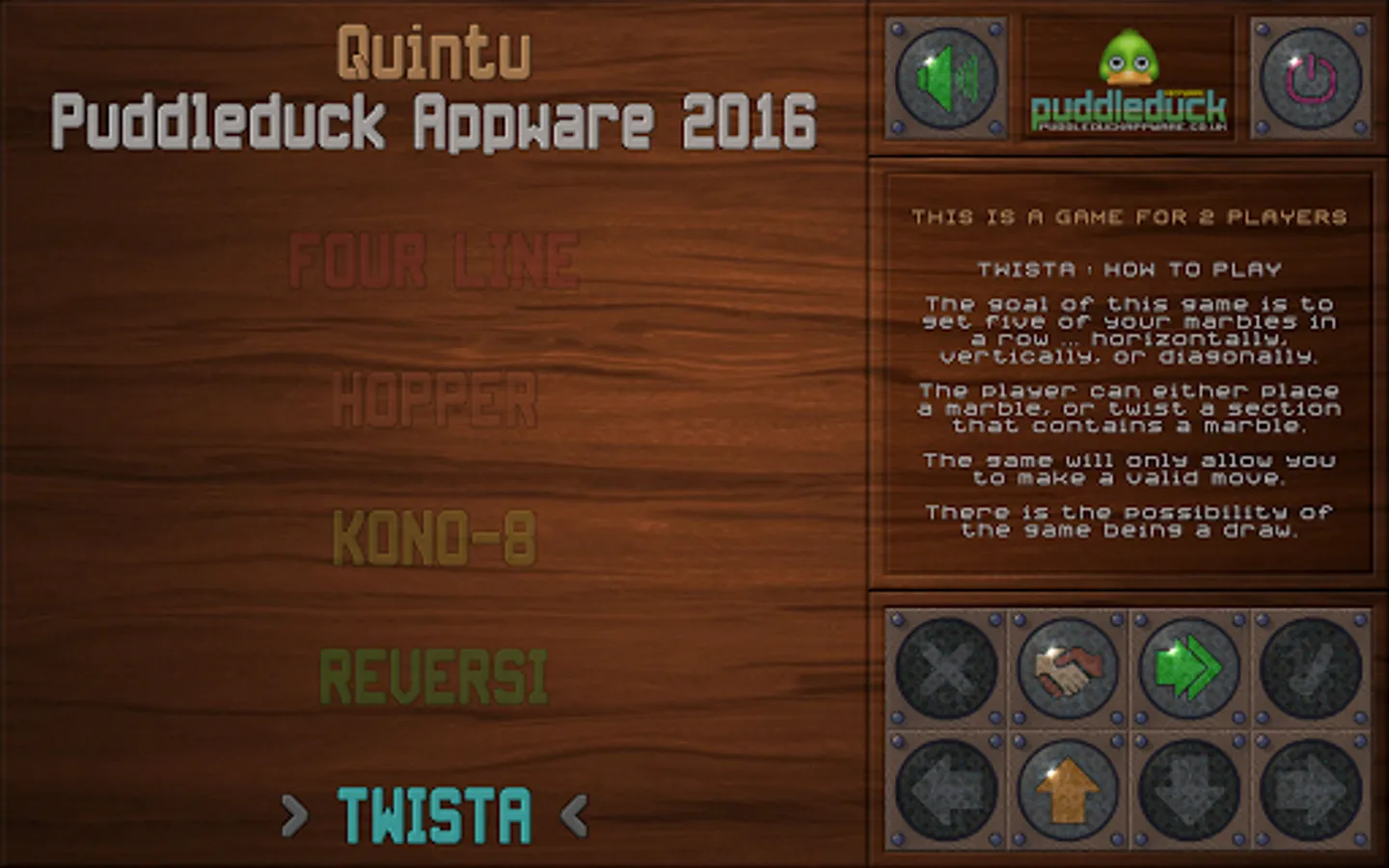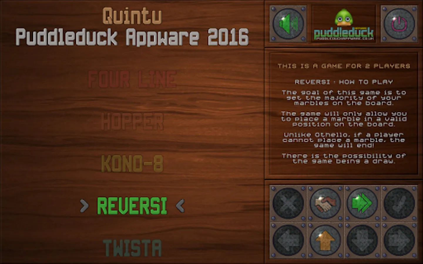 "Four Line" is the old favourite of getting four counters, or marbles, in a row. "Hopper", called Solitaire in the UK, and Patience in other parts of the world, easy to play, a challenge to complete. "Kono-8" is a slightly different version of the Korean Kono game (they use 5 counters). Reversi, otherwise known as Othello, is a game of skill and strategy if you want to win. "Twista", a variant of getting counters in a line, this time five, but with the ability to rotate (ie twist) 2x2 sections of the playing board.