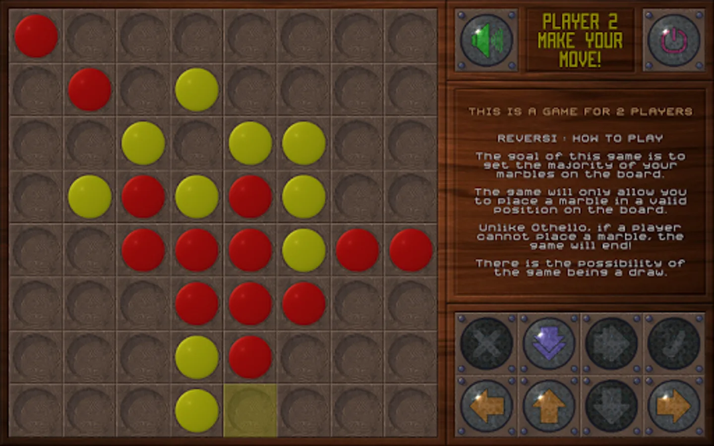 The goal of this game is to get the majority of your marbles on the board. The game will only allow you to place a marble in a valid position on the board. Unlike Othello, if a player cannot place a marble, the game will end! There is the possibility of the game being a draw.