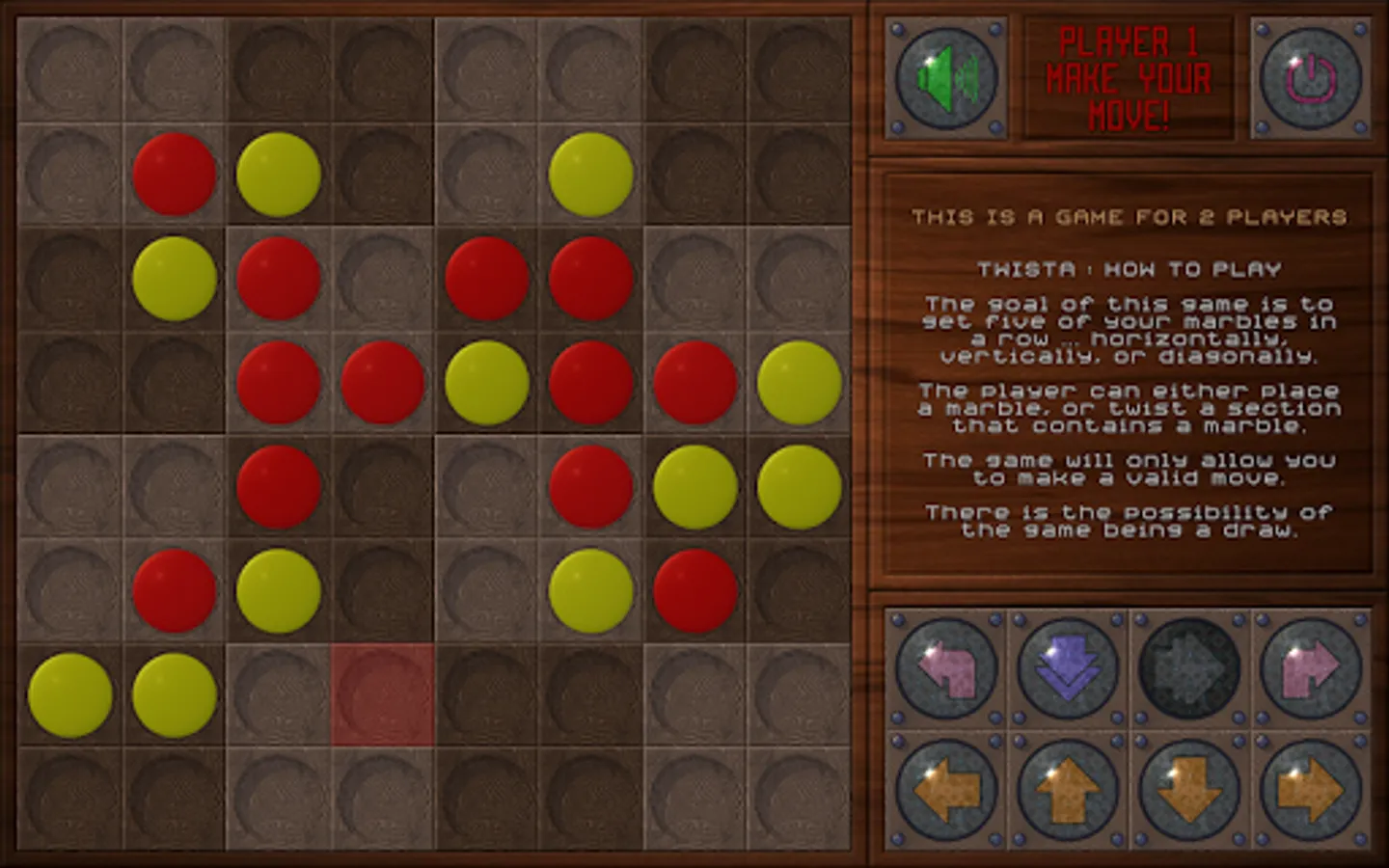The goal of this game is to get five of your marbles in a row ... horizontally, vertically, or diagonally. The player can either place a marble, or twist a section that contains a marble. The game will only allow you to make a valid move. There is the possibility of the game being a draw.
