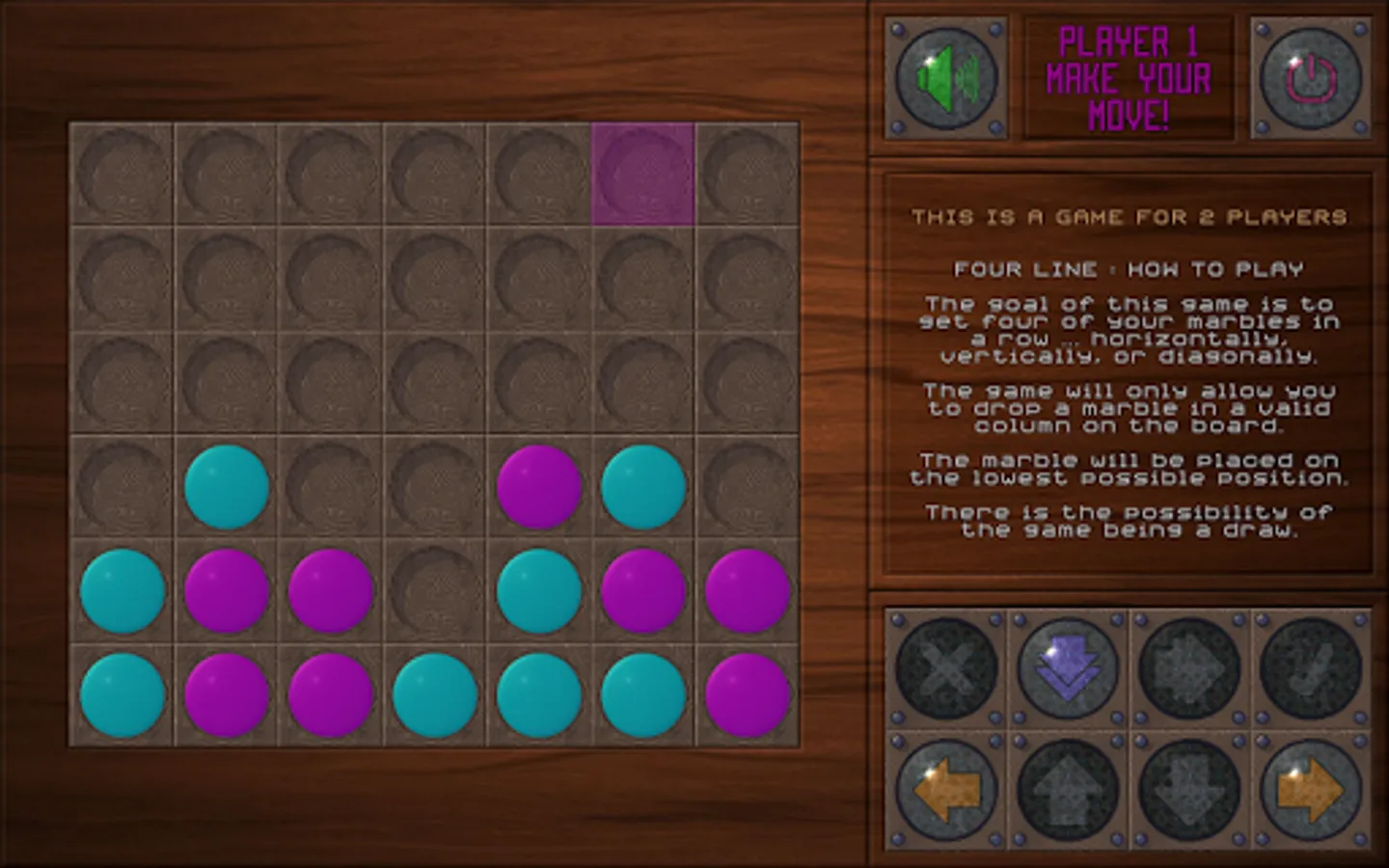 The goal of this game is to get four of your marbles in a row ... horizontally, vertically, or diagonally. The game will only allow you to drop a marble in a valid column on the board. The marble will be placed on the lowest possible position. There is the possibility of the game being a draw.