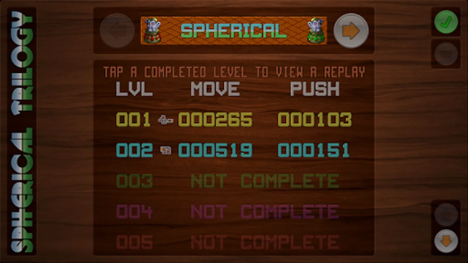 A record is kept of your progress through the game ("statistics"), and each part of the game has separate records. When viewing your statistics, tapping on the record for any completed level will show you a replay of how it was done (or simply to show your friends).