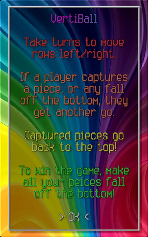 If a player captures a ball, by dropping the other players ball onto it, or any fall off the bottom, then that player gets another go. Be careful though, one wrong move and you could drop one of the other players balls onto your own, it'll still count has a capture, but atleast you get another go.