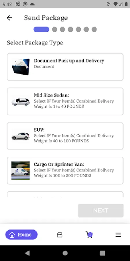 Click send packages, scroll up and down and select one of the different service tabs to select a vehicle that fits your package type. The description on each service tab is different and will help you match your package size, as far as weight and dimensions, with the correct size vehicle.