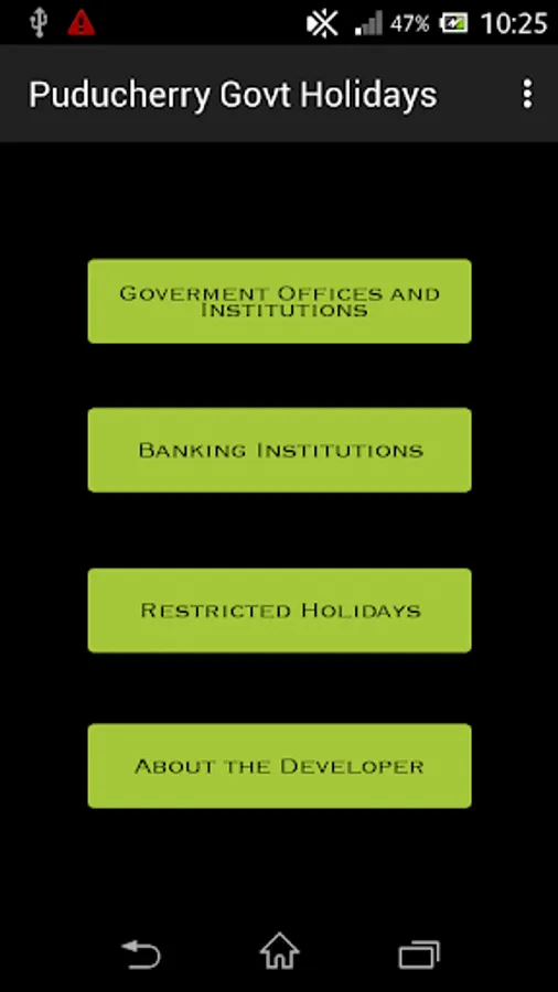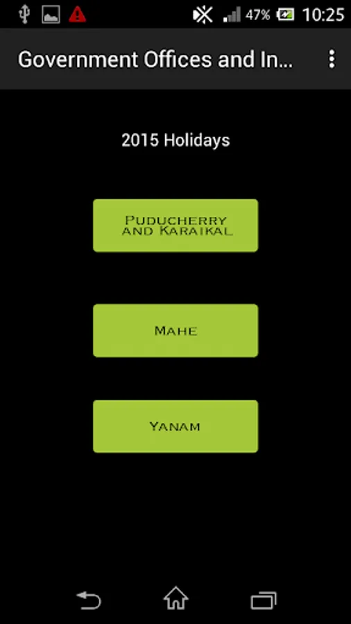 This application is an one step solution for all academicians, government officials, students, teachers, professors, and to each and every resident of the puducherry union territory to look at the list of government holidays in your mobile phone itself. The application is organized in an user friendly way. The leave list is categorized into three categories namely: