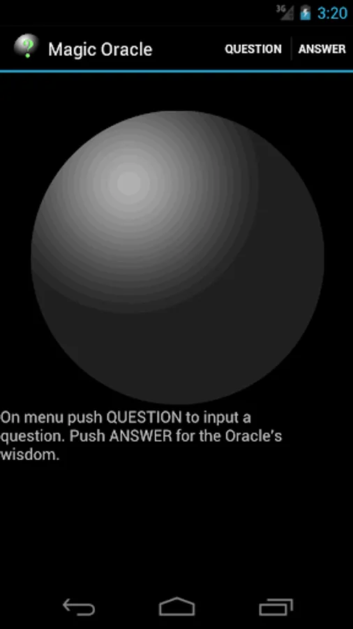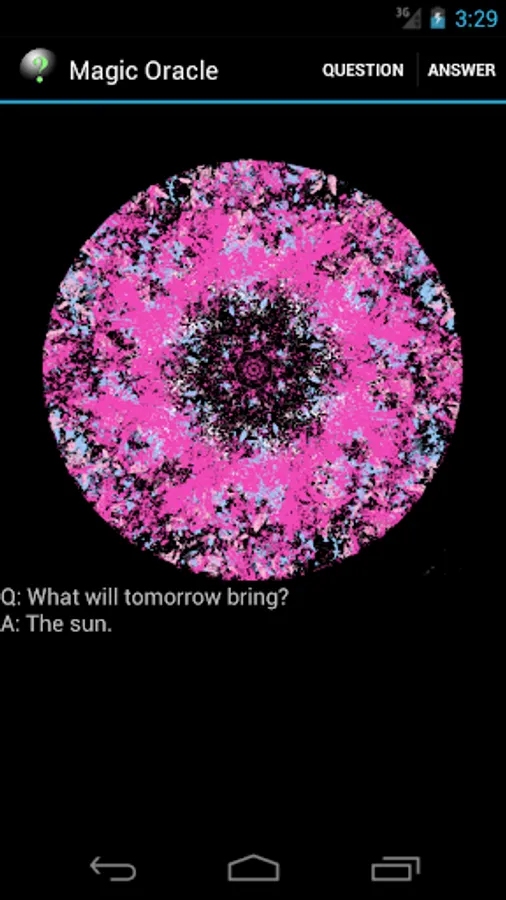 Pressing QUESTION on the menu will provide a space for the input of a question. Pressing ANSWER will provide the answer. Mystic sounds will emerge, and swirling patterns will appear, along with words of (perhaps) wisdom.