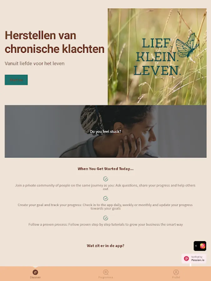 Met de Lief Klein Leven app kan jij weer gaan leven. Deze appt helpt je met herstellen van chronische klachten vanuit liefde voor het leven.