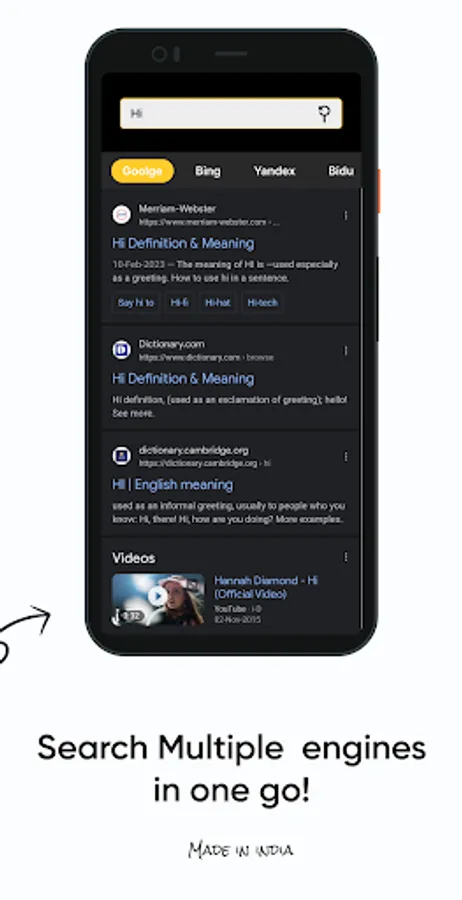 OneHunt is what it says. It allows you to do a web search with a wide range of search engines. Save time and data by not having to visit sites everytime to search. Instead land directly on the results page. Has a list of search engines like Google, Bing, Youtube!, Wikipedia .