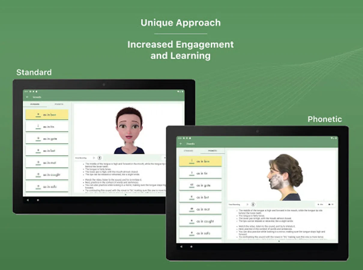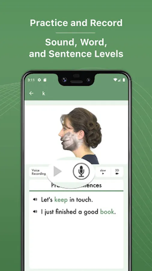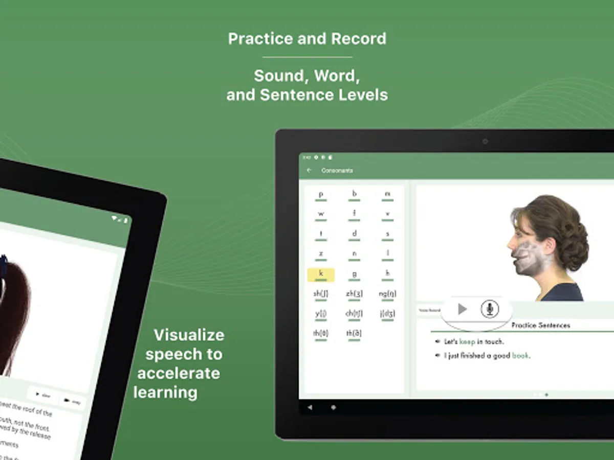 With the ability to see inside the mouth so you can easily mimic what you're seeing, SSV provides a unique experience that makes it easy to both follow along and master the specific pronunciation of each sound. In addition, you also have the ability to record and listen back to your performance to assist your pronunciation to perfection.