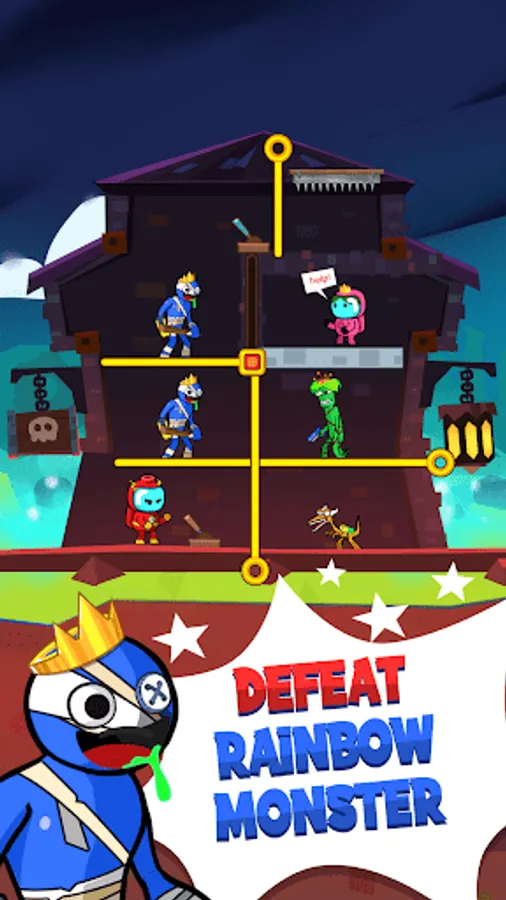 With Rainbow Friends - Pull the Pin, you need to help Imposter pass challenges, such as pulling pins to kill Rainbow Friends monsters, rescue the princess, and collect gold to build factories. Therefore, you must use all your wits to pull the pin logically.
