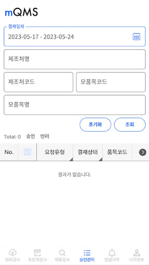 - Approval management function: In addition to approval of product inspection results entered from mobile, you can check the list of various requests* requested for approval from PQMS and approve them from mobile. (*Approval for enactment and revision of QMS documents, raw material inspection, packaging material inspection, process inspection, sanitation inspection, and approval for nonconformity handling)