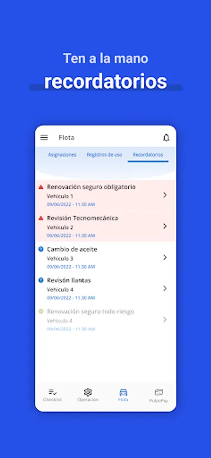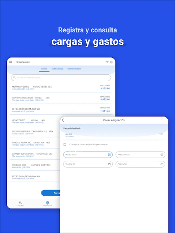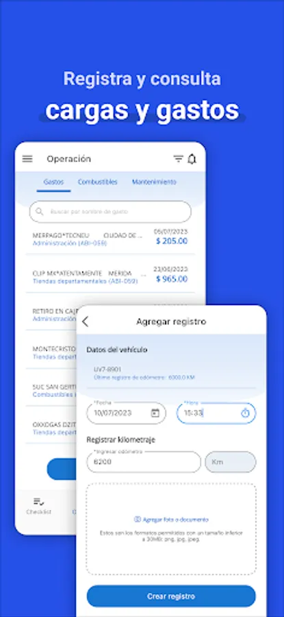 Tus conductores además podrán registrar sus cargas de combustible y odómetros para controlar el kilometraje, registrar gastos (viáticos, peajes, etc.) y consultar la documentación digital del vehículo.