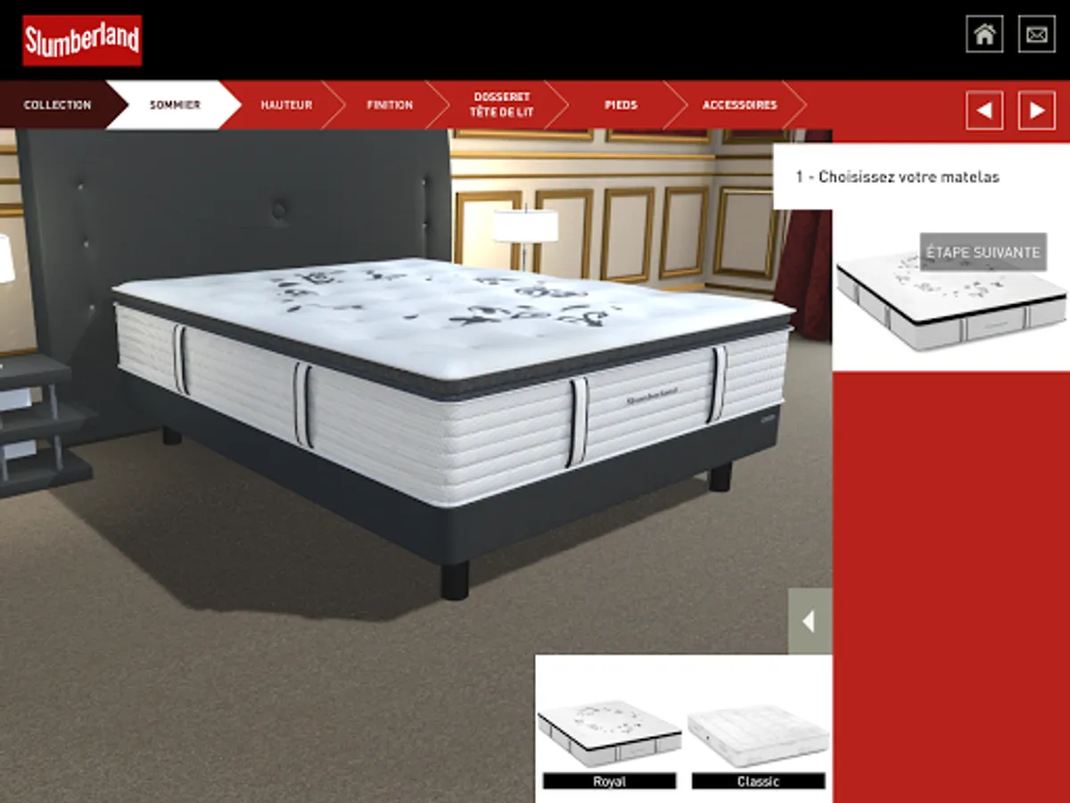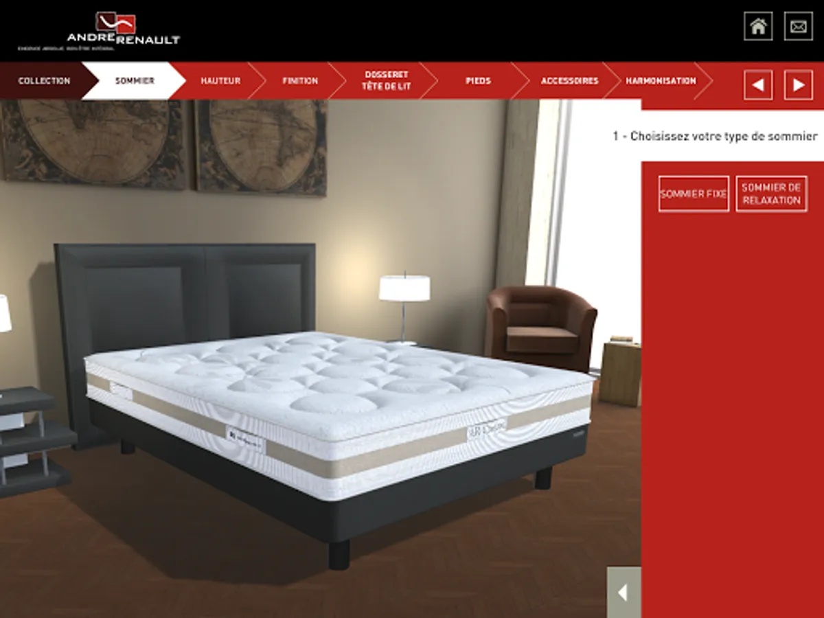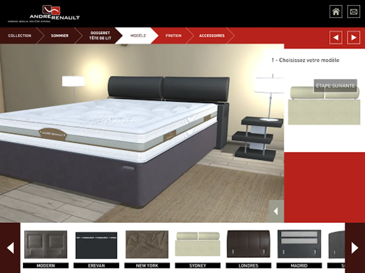 Available from our exclusive retailers, this application allows you to precisely configure our bedding sets AndréRenault and Slumberland. You can incorporate your mattress, box spring, backsplashes, headboards and other accessories you can then preview in the desired finish from a very wide range of fabrics and wood finishes AndréRenault and Slumberland.