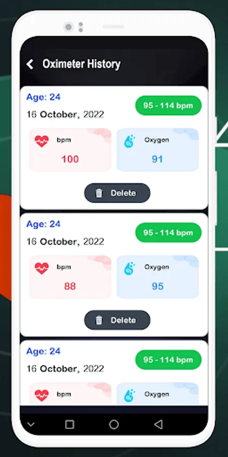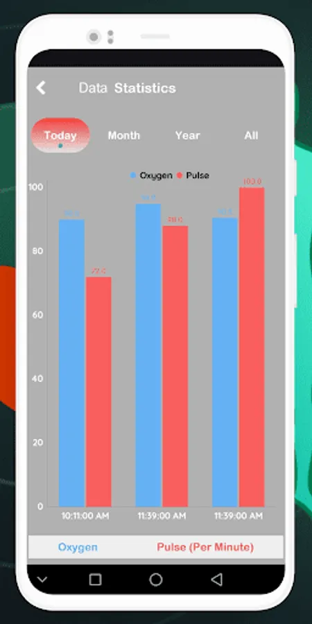 Pulse App and pulse oximeter tracker app stores your oxygen and pulse rate values and does not measure your pulse and heart rate. The values and graphs are only for identical purpose of oximeter measurements.