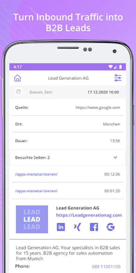 Which companies did visit your website? Who are the contact persons within these companies? What product or service are they mostly interested in? We show you detailed company information, list of employees and contact details - thus everything you need for a successful B2B lead acquisition.