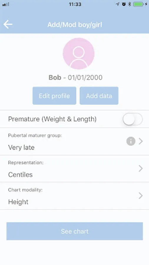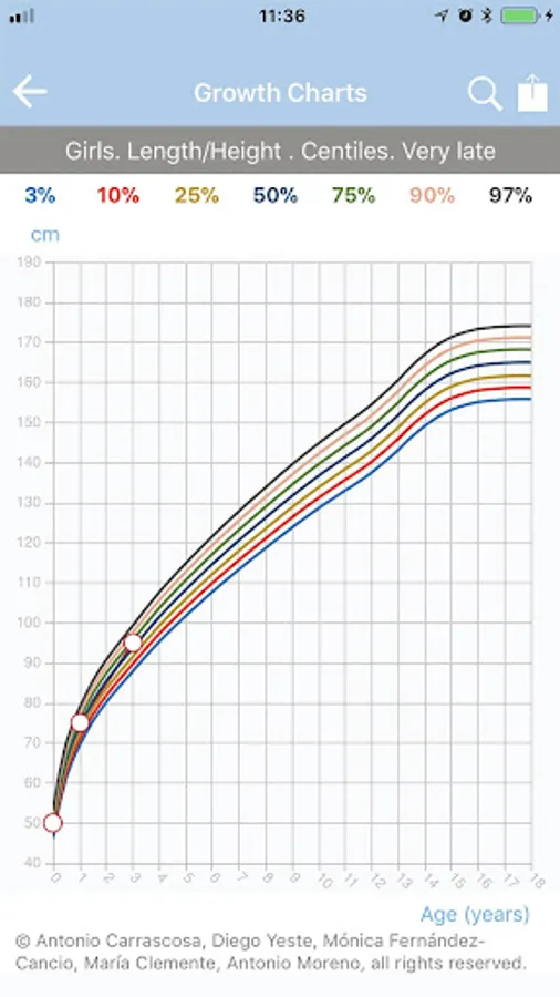 Record unlimited dates, weights and lengths or sizes of their children, and see the representation of your data (entered and calculated) over time under five different graphics modes, each with seven lines of percentiles or type z-scores deviations (SDS) smoothed:
