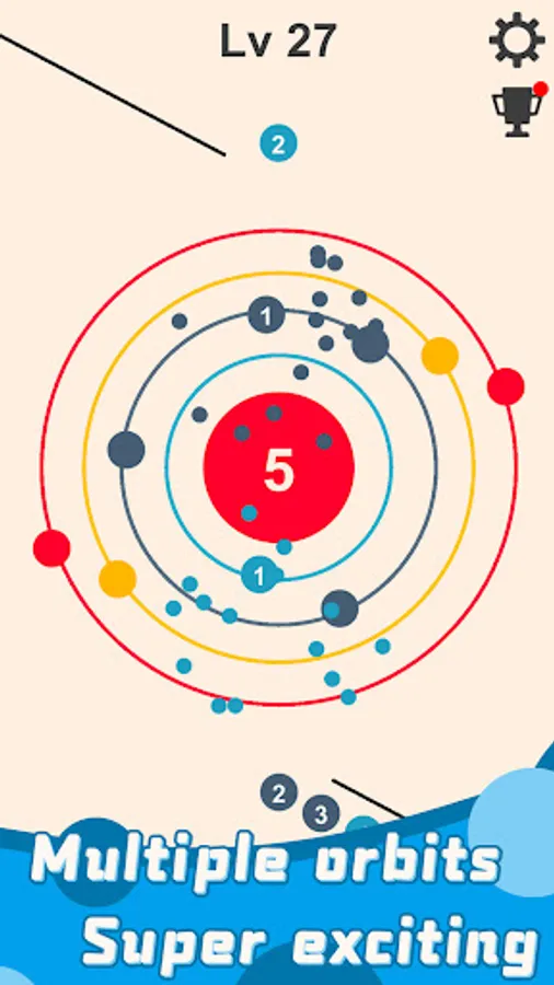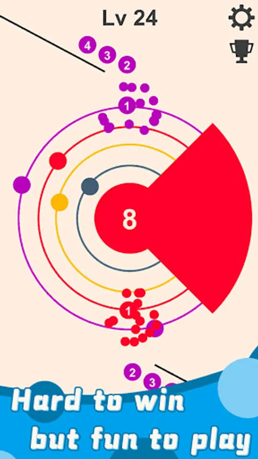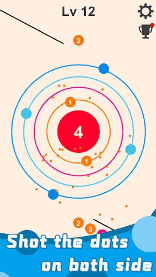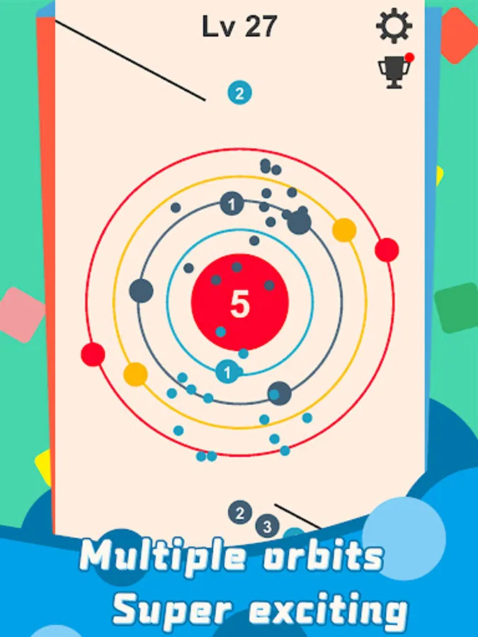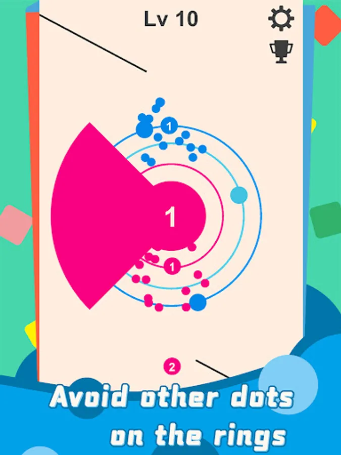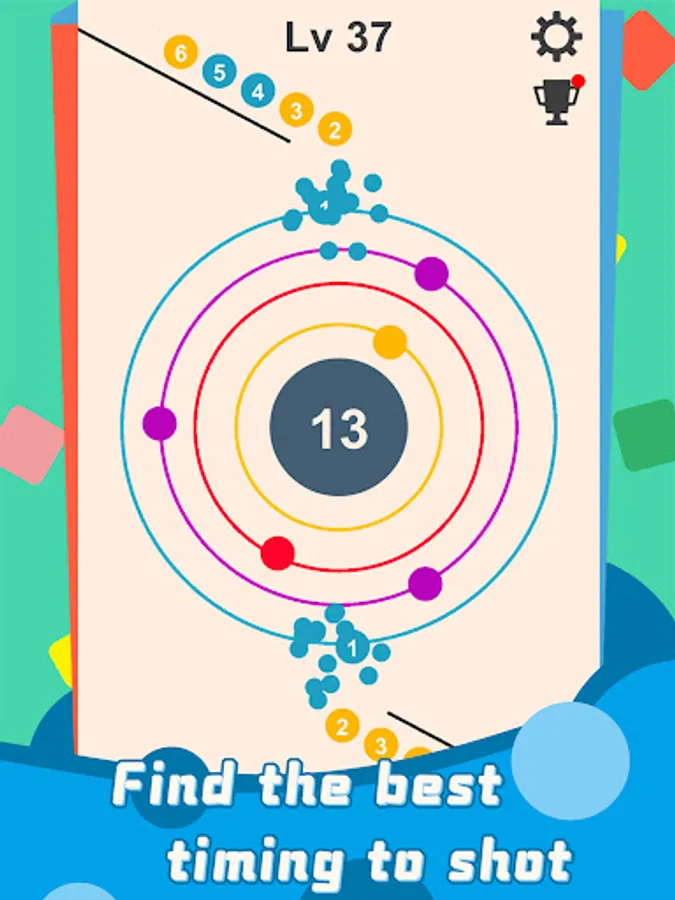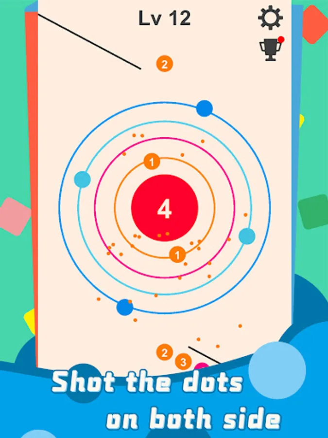 Immerse yourself in a game screen that resembles a cosmic galaxy. At its core, you'll find a massive center surrounded by up to 4 tracks. The game features dual orbits, with 2 dots moving in opposite directions. Your task is to strategically shoot these dots onto the tracks, ensuring they align with dots of the same color.