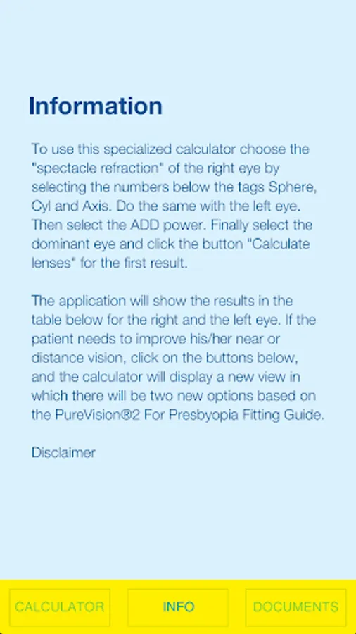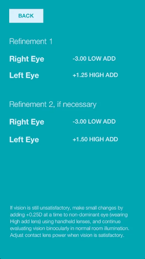 The PureVision®2 For Presbyopia Fitting App by Bausch & Lomb is designed to provide a starting point for multifocal lens selection and modification. Final Prescription should be determined by your normal multifocal lens fitting practices.