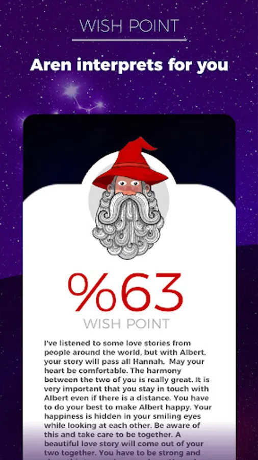 When you tell Aren your wish come true, she will comment for you. For this, you need to take a horoscope test that is compatible with your wish. You can share your horoscope interpretation on any platform you wish. You will get the answer from the stars on everything related to love compatibility, horoscope compatibility, knowledge test, solution and money. Good timing to make your wishes come true. Make a wish come true.