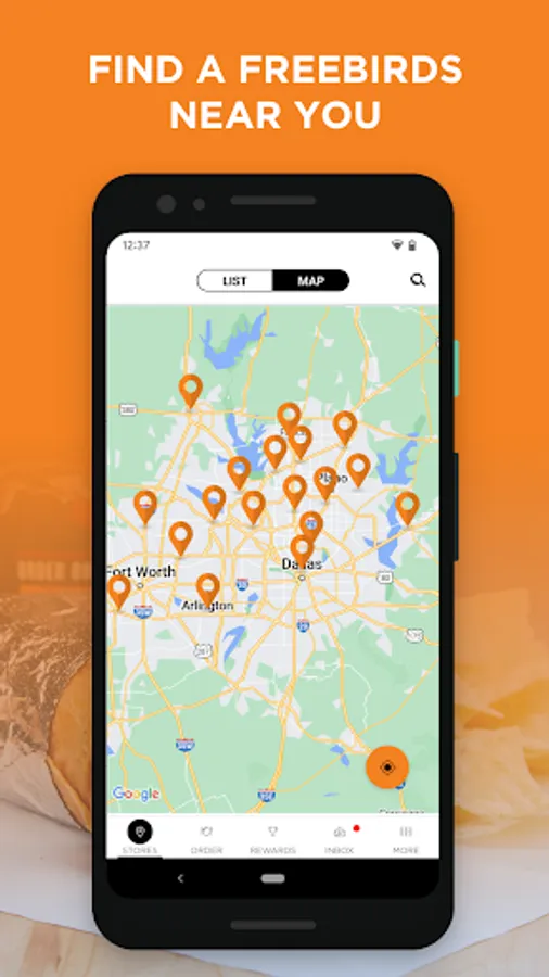 - Map view- Uses your phones GPS to find the closest Freebirds store location.