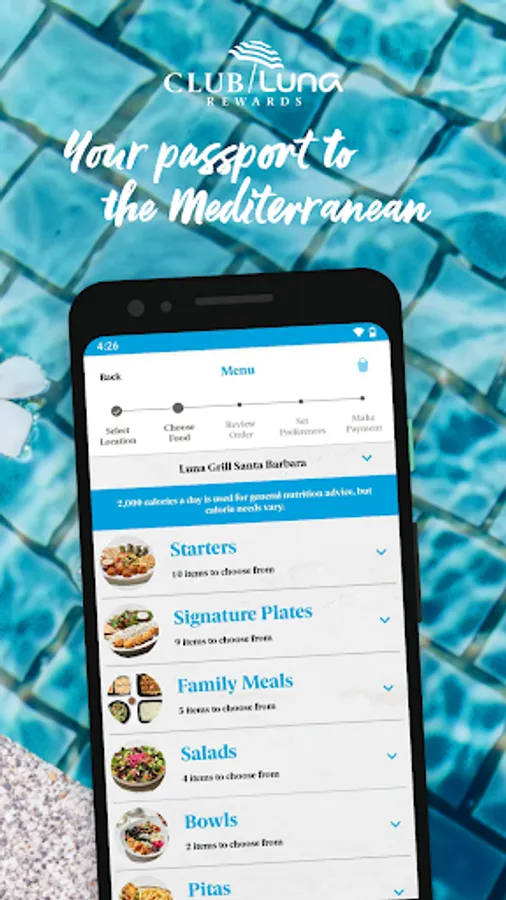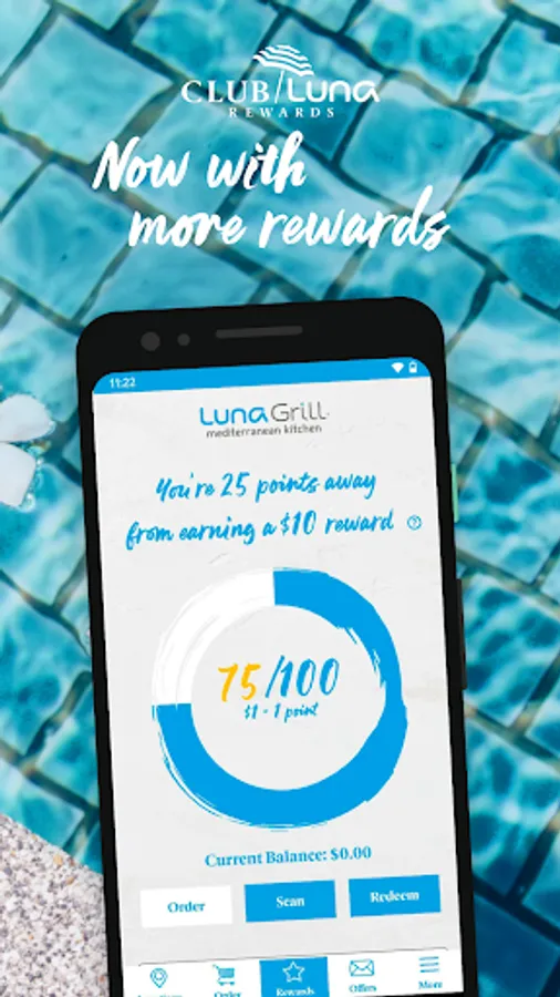 Download the Club Luna Rewards app and start earning $10 for every $100 spent. Use the app for simple and convenient ordering for delivery, curbside or in-restaurant pickup. Find a location near you and receive special offers. Enjoy the delicious flavors of the Mediterranean, like signature kabob plates, gourmet salads, appetizers including hummus and falafel, wraps, bowls, desserts, craft beer and wine — just add sea, sun and salt air. It’s nostimo!