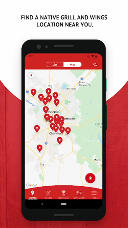 -Map view- Uses your phones GPS to find the closest Native Grill & Wings store location.