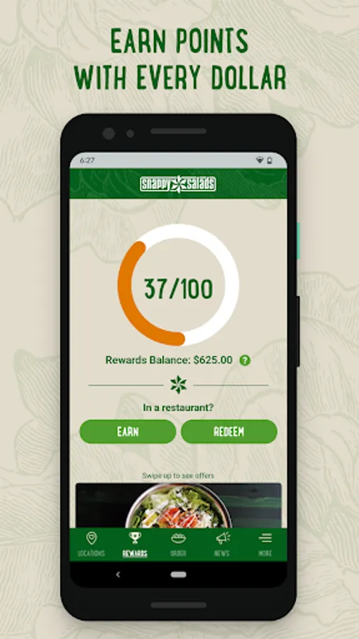 Welcome to the Snappy Salads mobile app. Getting your hands on your favorite salad just got easier. Use the app to place your to-go orders or skip the line and order ahead. Enjoy fresh eating and while earning points for every dollar you spend with our new Snappy Salads Rewards Program. Once you reach 100 points, you'll start receiving special rewards and offers to continuously enjoy Snappy Salads. Receive the latest news on upcoming menu items, special offers, new restaurant openings