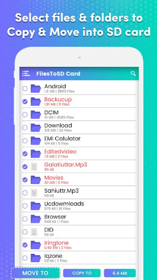 Transfer phone to SD Card – FilesToSd Card is a tool which allows to copy or move any files & Folders from any folder on the SD card. Save phone memory by identifying and listing all applications that can be moved to SD Card.
