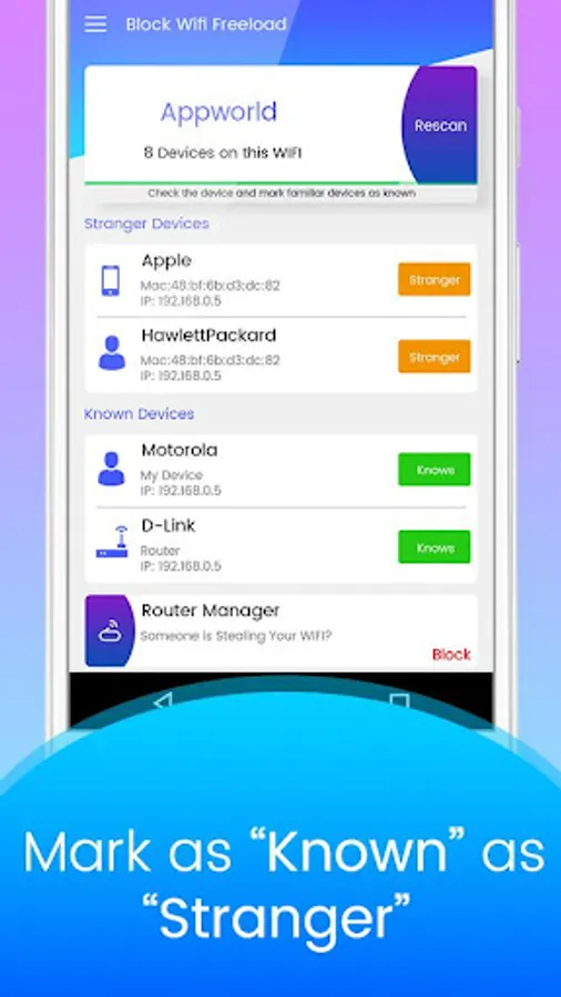 Using this app, in seconds you know how many and which device is connected to your router with information like IP address, MAC ID and vendor info.