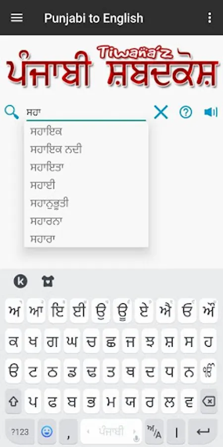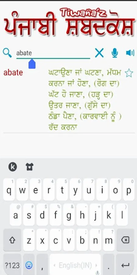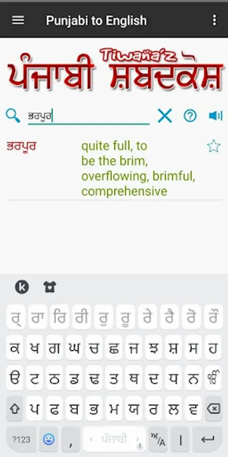 Punjabi Shabdkosh is an English to Punjabi vice versa dictionary app to get word meaning from English to Punjabi and Punjabi to English as well. This is the extended version of Punjabi Shabdkosh desktop dictionary (since 2003). App has huge database of English-Punjabi words used in daily routine life. User can also add or modify the words and their meanings in the dictionary. App works offline and also support voice search.