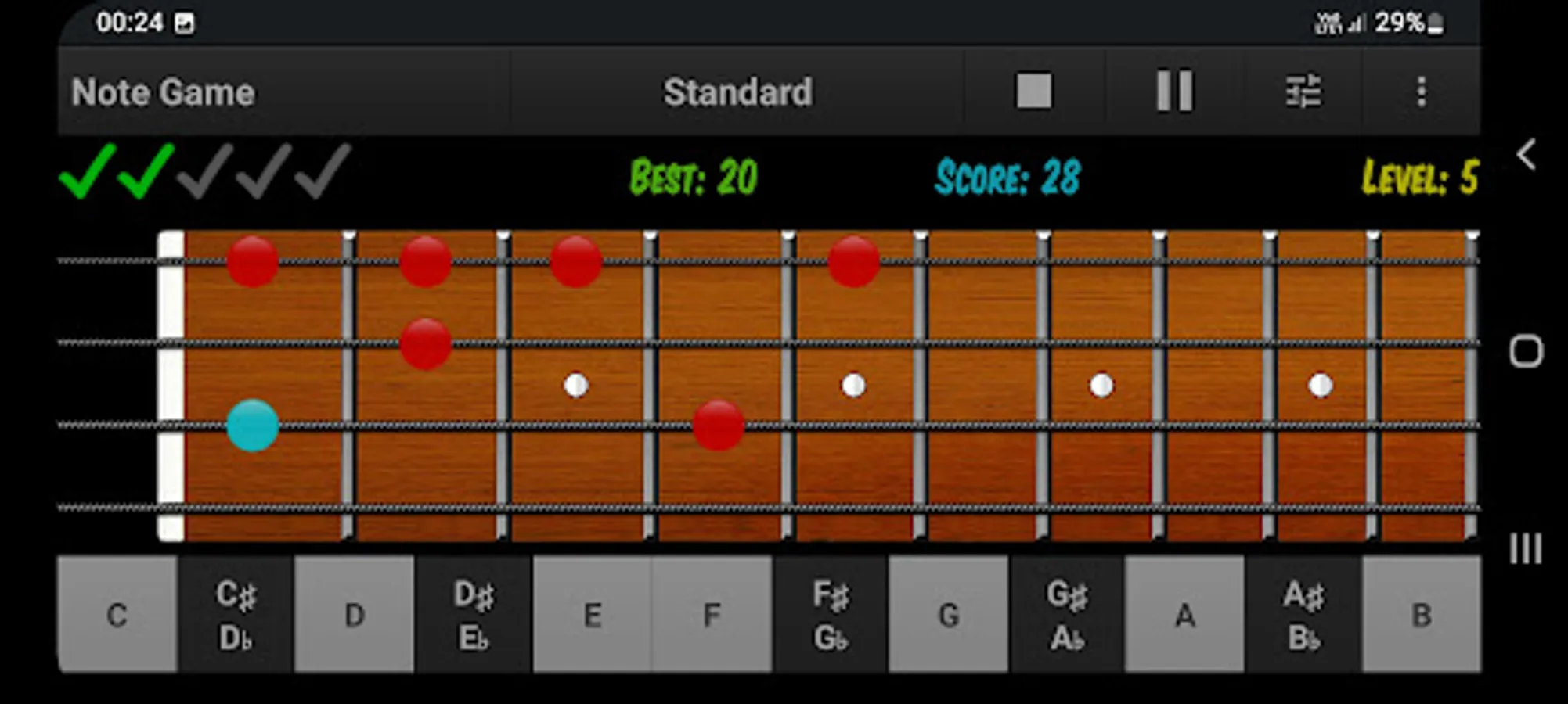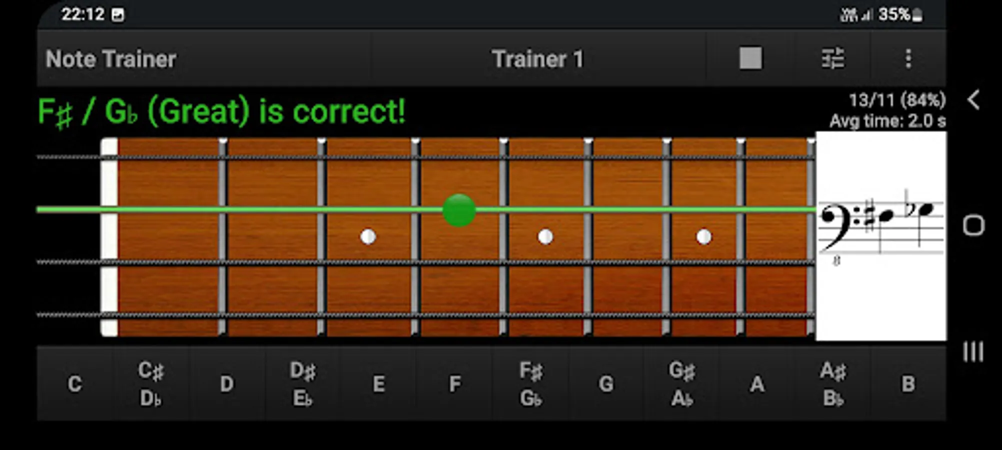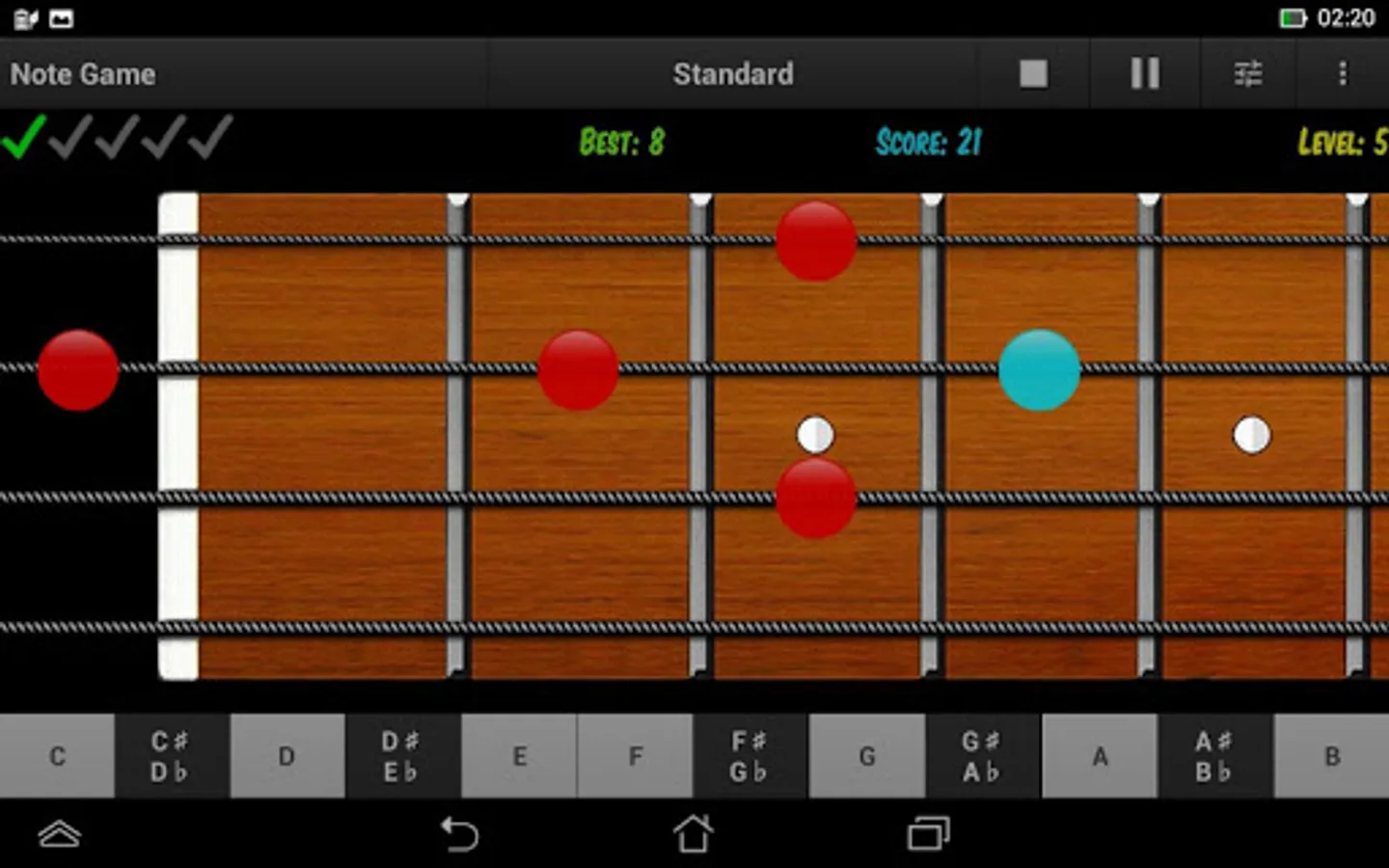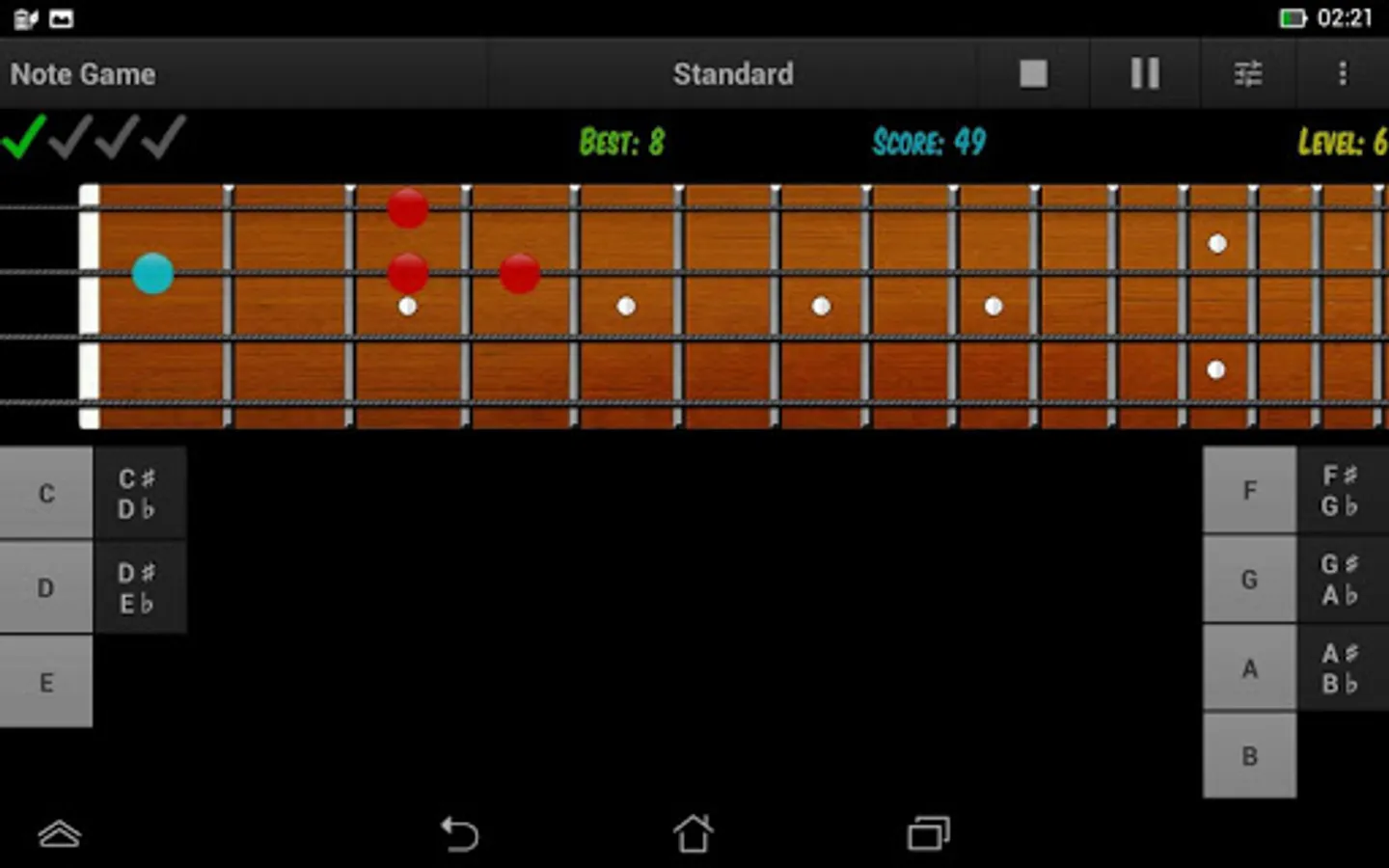 GAME MODE offers a more efficient way of verifying the knowledge and learning the notes on the bass guitar fretboard by playing and having fun.