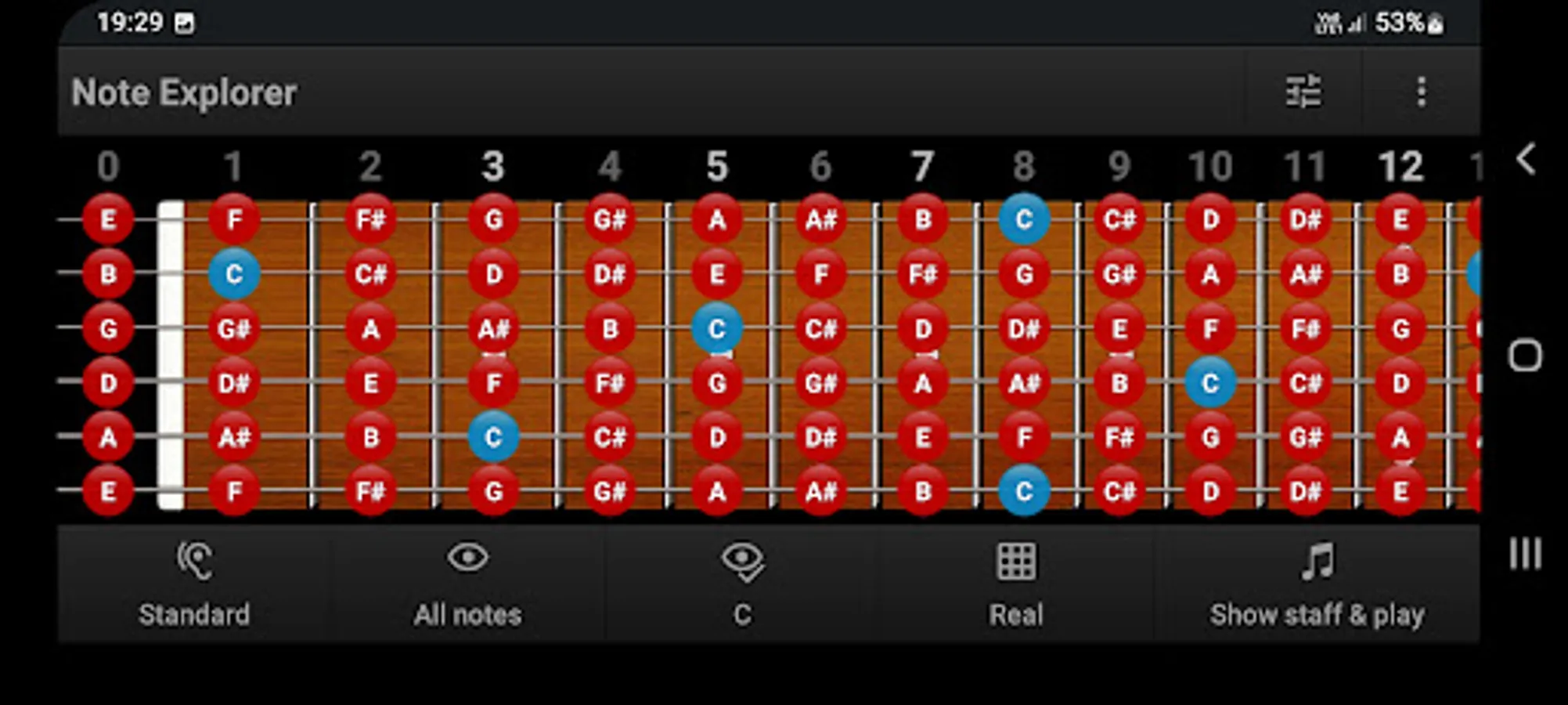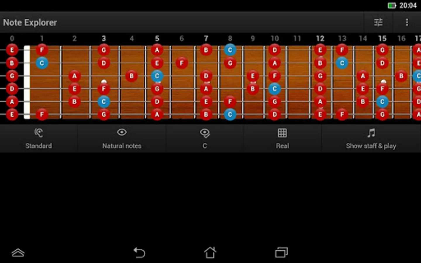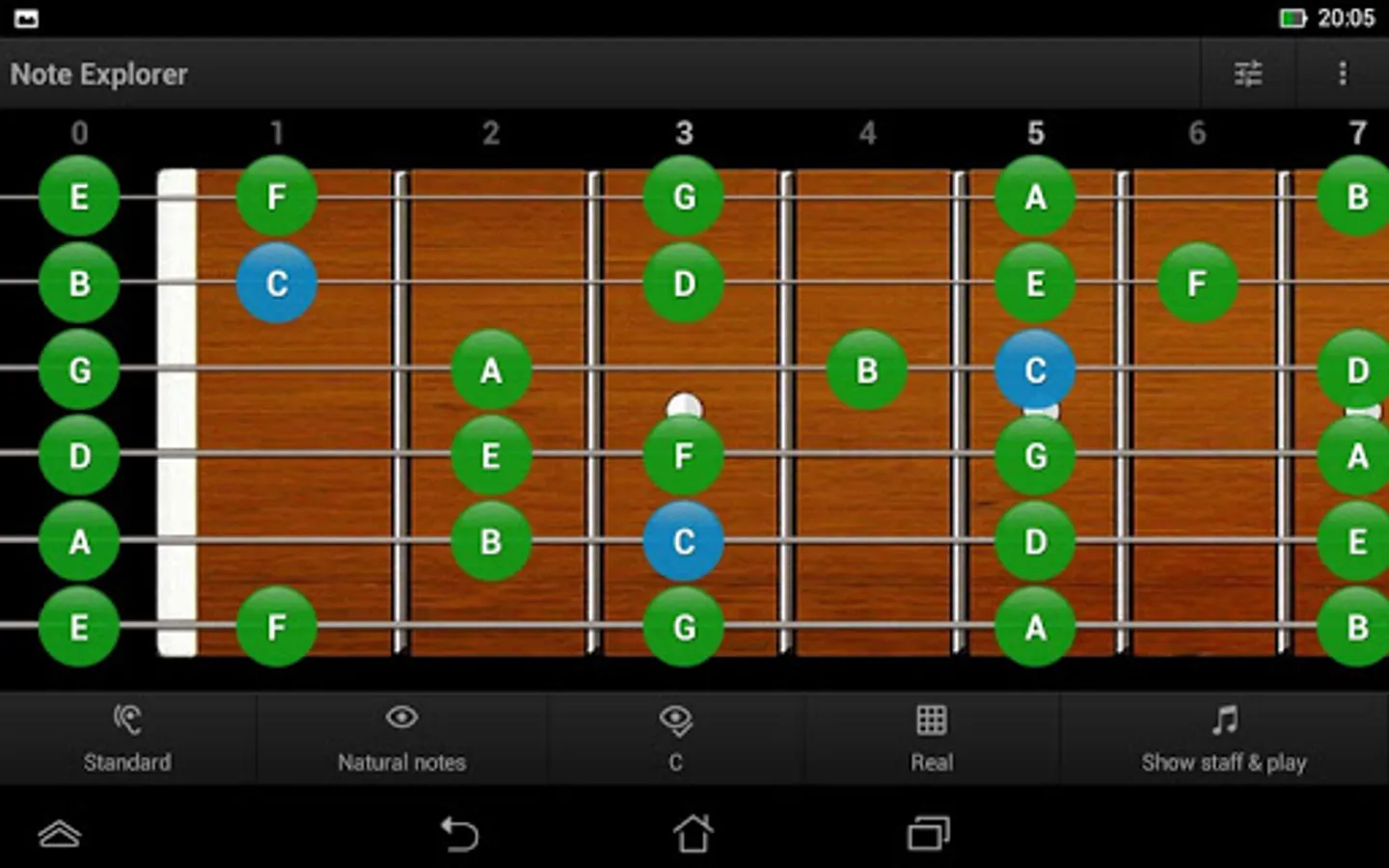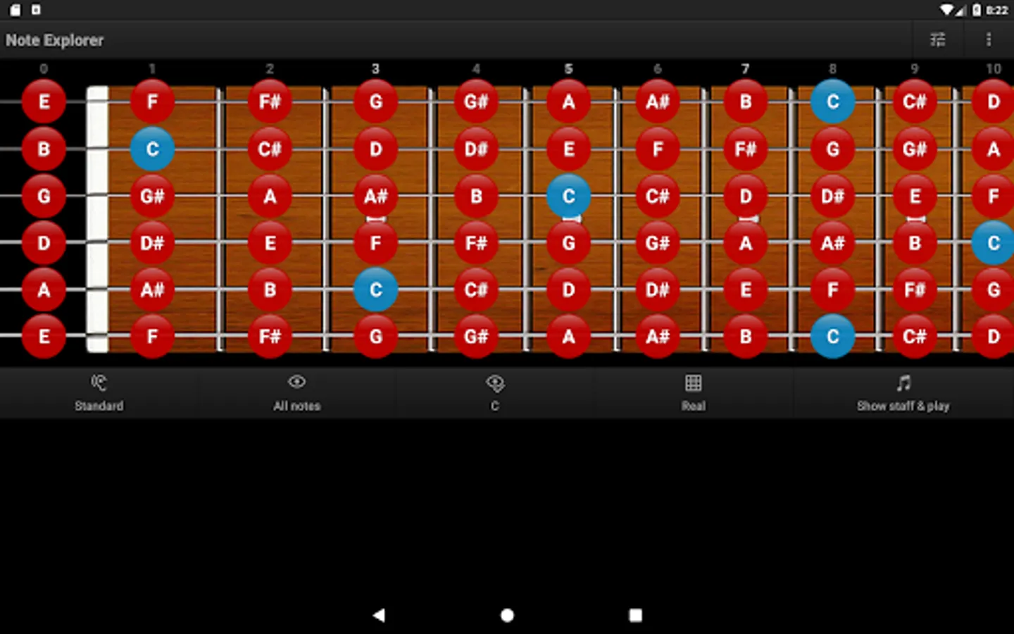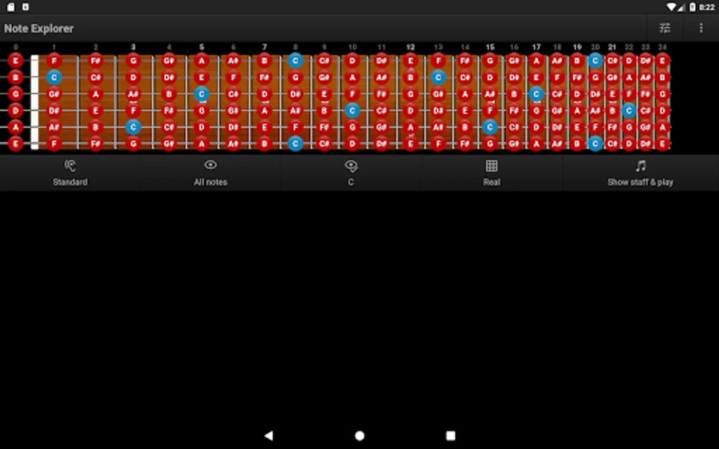 EXPLORER MODE displays/hides notes on the fretboard or on its diagram, using various user-adjustable filters and highlighting, and also allows you to choose the explorer action for touching notes on the fretboard of the guitar simulator.