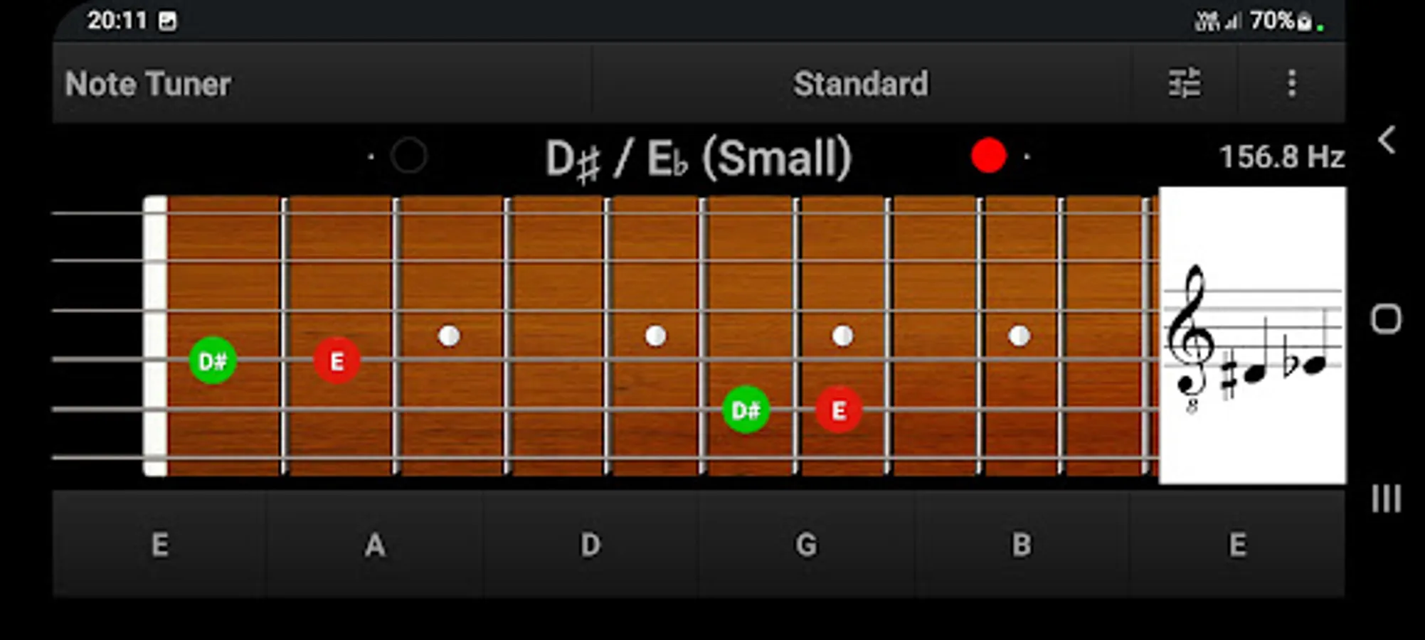 TUNER MODE is a guitar tuner (45-2034 Hz) that displays on the fretboard all the positions of the recognized note of the real instrument, frequency and its staff notation.