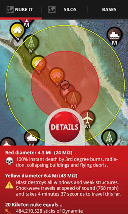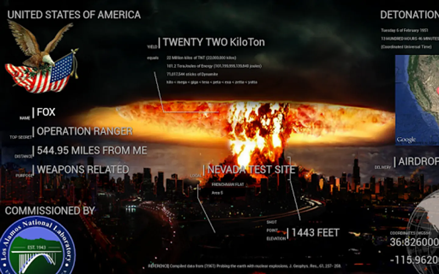 The world's MOST COMPREHENSIVE nuclear bomb app, "Nukes USA". See where the nukes detonated, their craters, the yield, destruction estimations, and much more. This app contains all 1127 US nuclear weapon detonations from the last 72 years. Also included are locations of all underground missile silos, nuclear power plants, nuclear military bases, and 18 hours of authentic public awareness videos made by the US army. You won't find anything like it on the internet, in books or any other app!! Not even the National Atomic Testing Museum in Nevada has this amount of information on show! I've been there, I checked.