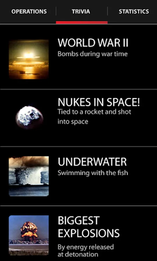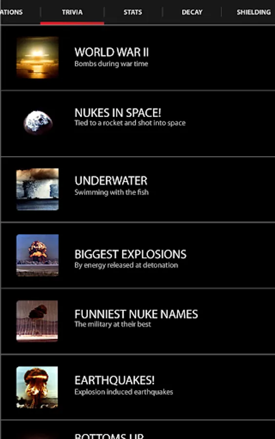 * 24 entertaining trivia categories with listings of the biggest bombs, bombs with the funniest names, nukes shot into space, etc.