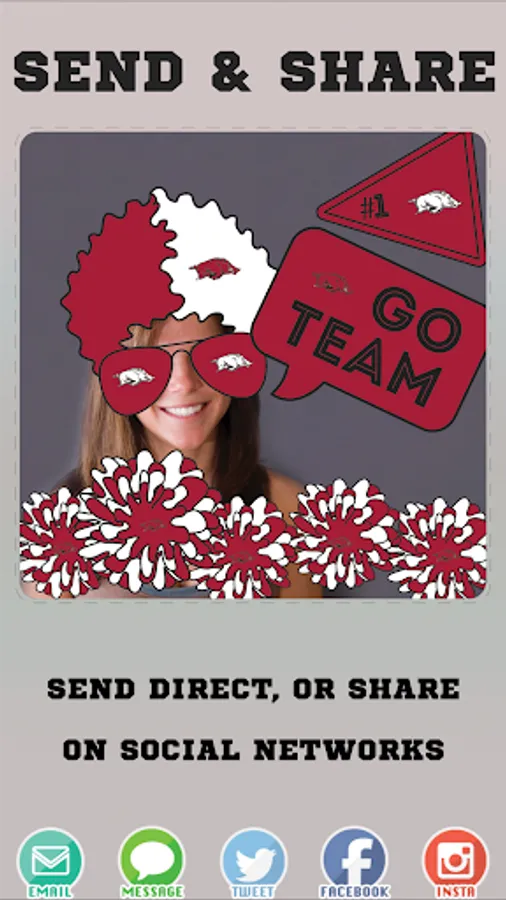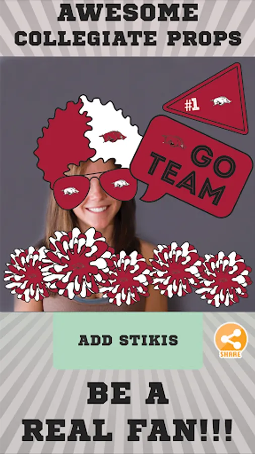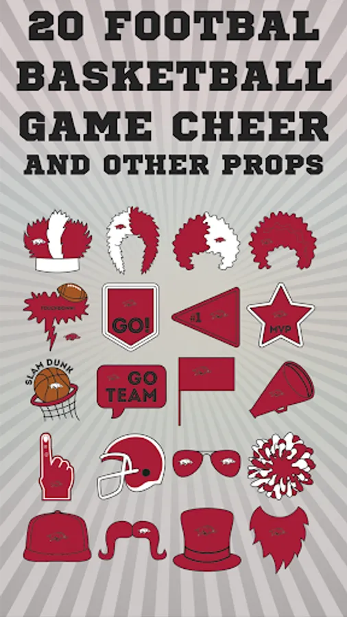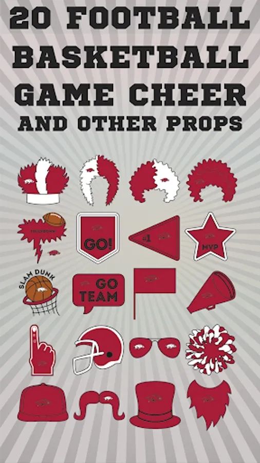 Arkansas Razorbacks Selfie Stickers app lets you add awesome, officially licensed Arkansas Razorbacks stickers to your selfies and other images. You can add Arkansas Razorbacks branded footballs, basketballs, glasses, hats, shirts, foam fingers, hair, helmets, word bubbles and much more. Afterwards, share them with your friends through email, messaging, Instagram, Facebook, and Twitter. Become the Arkansas Razorbacks fan you were meant to be!!!