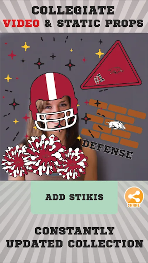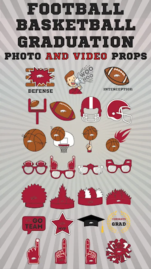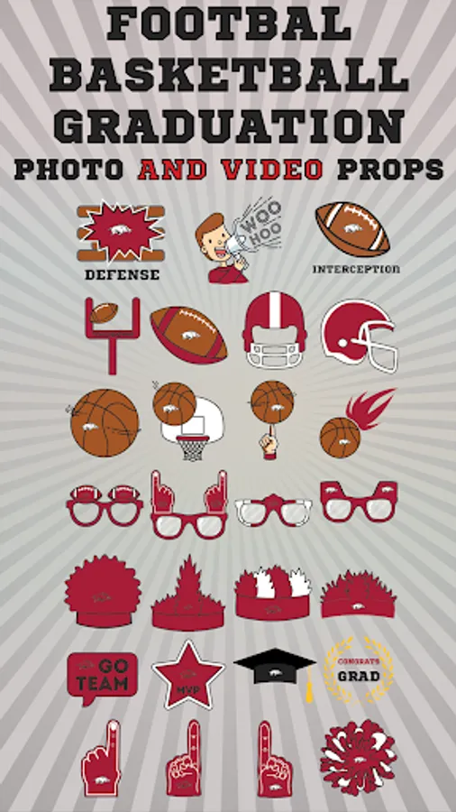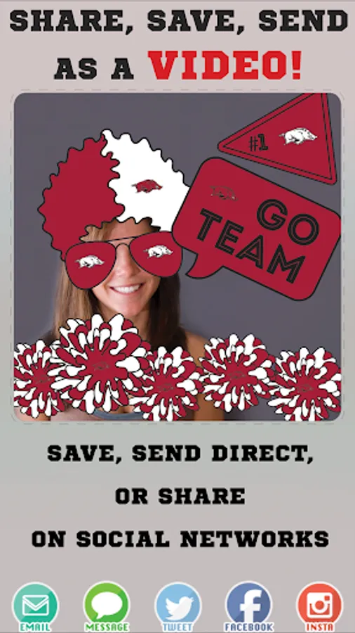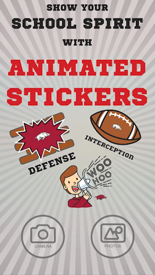 Arkansas Razorbacks Animated Selfie Stickers app lets you add awesome, officially licensed Arkansas Razorbacks animated and graphic stickers to your selfies. You can add a variety Arkansas Razorbacks animated stickers such as Arkansas Razorbacks Defense, Interception, Touchdown, Cheering Fan and more. You can also add graphic stickers such as branded glasses, hats, shirts, foam fingers, hair, helmets and much more. Afterwards, share them with your friends through email, messaging, Instagram, Facebook, and Twitter. Or save them to your photo gallery for future use. Become the Arkansas Razorbacks fan you were meant to be!!!