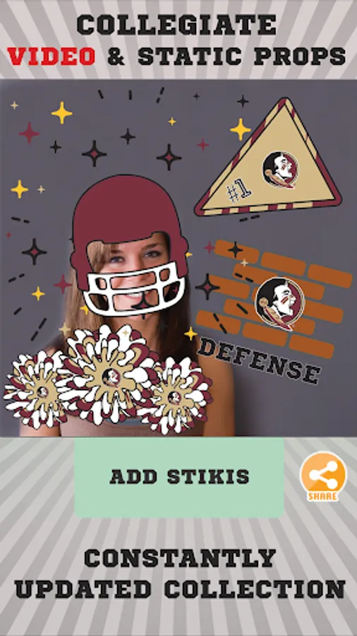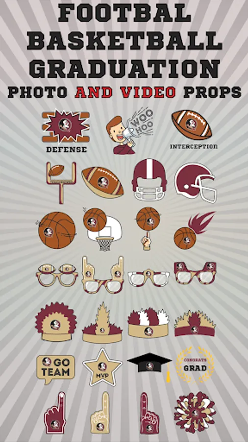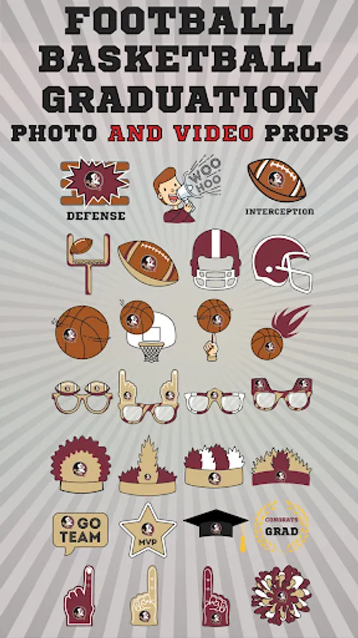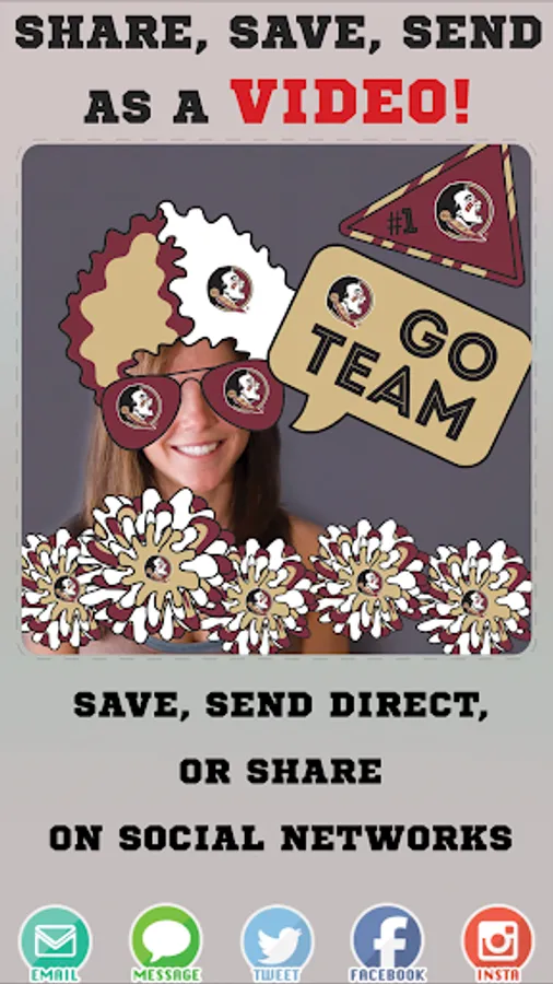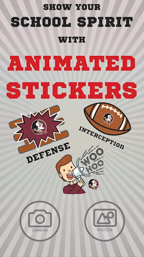 Florida State Seminoles Animated Selfie Stickers app lets you add awesome, officially licensed Florida State Seminoles animated and graphic stickers to your selfies. You can add a variety Florida State Seminoles animated stickers such as Florida State Seminoles Defense, Interception, Touchdown, Cheering Fan and more. You can also add graphic stickers such as branded glasses, hats, shirts, foam fingers, hair, helmets and much more. Afterwards, share them with your friends through email, messaging, Instagram, Facebook, and Twitter. Or save them to your photo gallery for future use. Become the Florida State Seminoles fan you were meant to be!!!