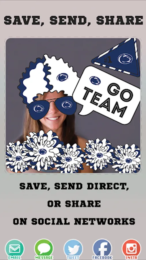 Penn State Nittany Lions PLUS Selfie Stickers app lets you add over 50 awesome, officially licensed Penn State Nittany Lions stickers to your selfies and other images. You can add Penn State Nittany Lions branded footballs, basketballs, banners, glasses, hats, shirts, foam fingers, hair, helmets and much more. Afterwards, share them with your friends through email, messaging, Instagram, Facebook, and Twitter. Or save them to your photo gallery for future use. Become the Penn State Nittany Lions fan you were meant to be!!!