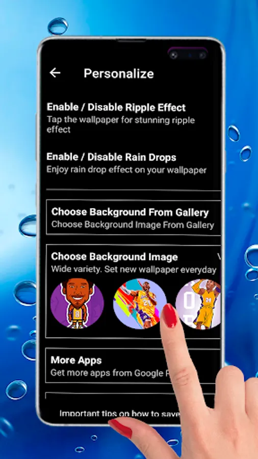 Fresh, new and stylish look is that you need today to be popular and trendy! Our cool Application will make your device nice and unique. Here are a great choice of different themes, which will satisfy any taste as adults, children and teens. Our cute and nice HD wallpapers with water ripple effect will make you happy! In addition, you will like that this FREE APP are very easy in using and customizing and does not waste your memory space and battery charge.