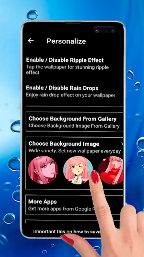 Fresh, new and stylish look is that you need today to be popular and trendy! Our cool Application will make your device nice and unique. Here are a great choice of different themes, which will satisfy any taste as adults, children and teens. Our cute and nice HD wallpapers with water ripple effect will make you happy! In addition, you will like that this FREE APP are very easy in using and customizing and does not waste your memory space and battery charge.
