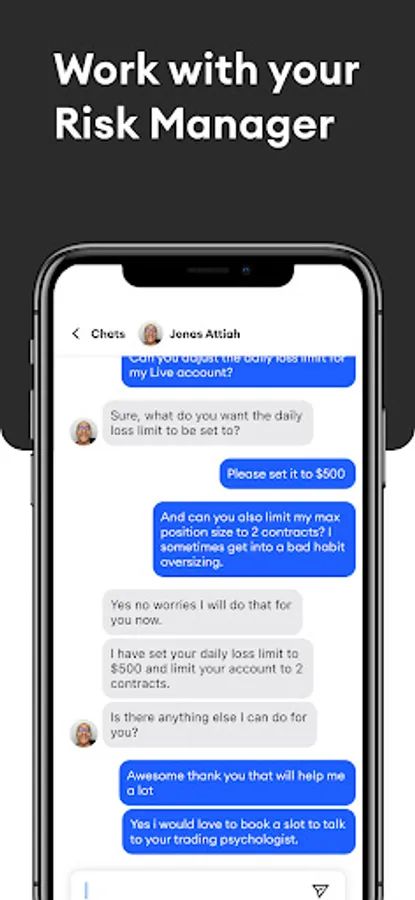 Our app is specifically designed to help you effectively manage risk and maintain accountability. Through advanced analytics and risk management tools available in the chat, you can optimize your trading strategies and make informed decisions. Immerse yourself in our professional trading environment, simulating the atmosphere of a real trading firm, which boosts your confidence and enhances your trading performance.