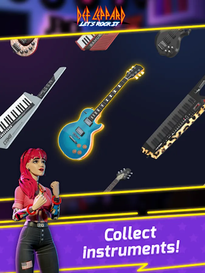 - Lots of instruments: guitars, drums, bass and more! Choose the one you like and go on stage!