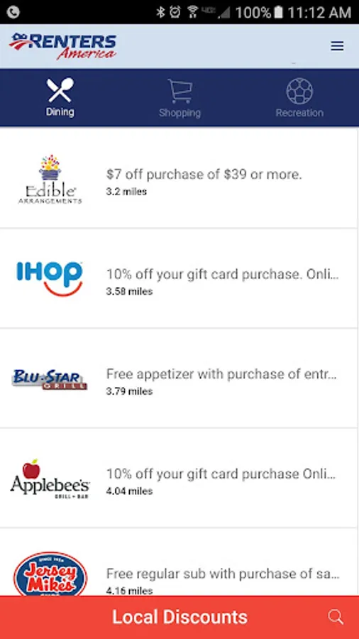 The Renters America Mobile App lets you to redeem merchant discounts on the go! No paper certificates required! Access discounts for Dining, Shopping, and Recreation merchants. Login to the app and choose a category to see merchants within a 50 mile radius of your location. Just select a merchant, hit redeem and show the merchant the details on the screen.